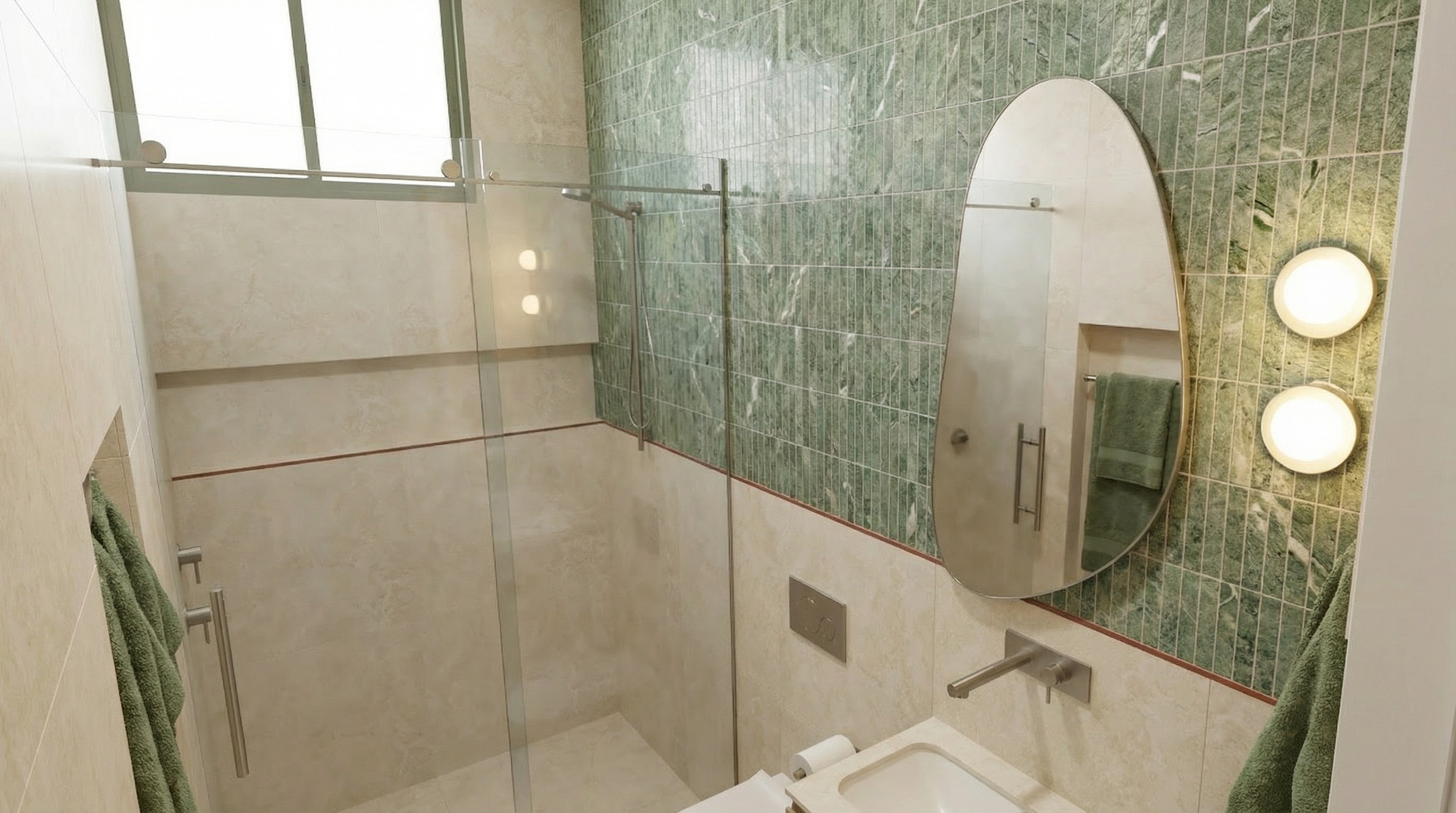 render this bathroom like the image on the floor and walls is a 600x1200mm creamy beige tile with subtle veining from the height of the top side of the niche along the right side wall is a green mosaic tile with greens and whites veining through it this means the line starts under the bottom wall sconce this tile goes to the ceiling add warm light from the sconces green towels are hanging on the towel rails and the towel hook brushed nickel tapware add a thin earth red colour border tile under the base of the green mosaic tile that runs in line with the base of the niche height