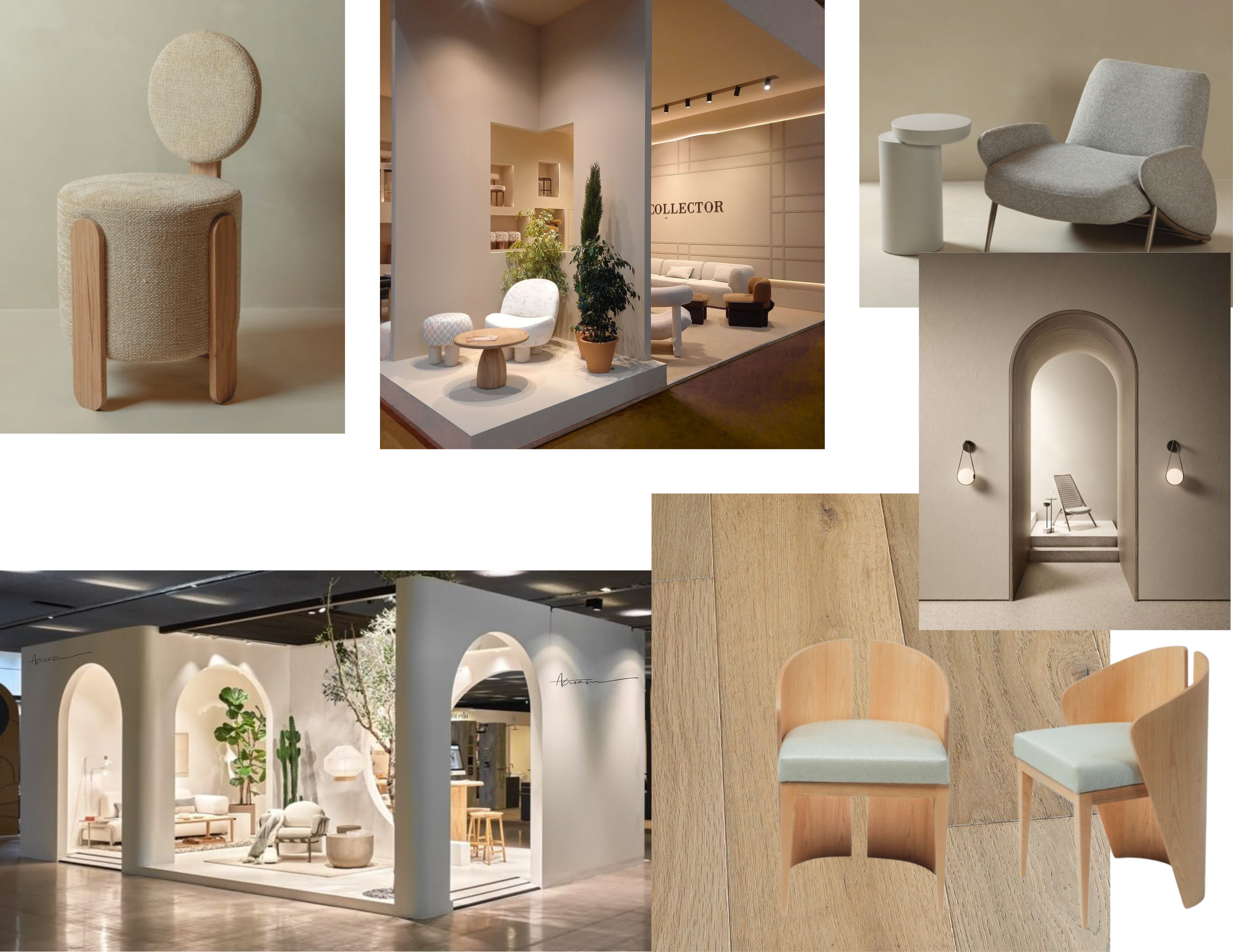 create a luxurious and modern interior scene featuring a blend of contemporary and minimalist design elements include a round beige upholstered chair with light wood accents the living room should have large archways curtains illuminating the off white plush sofa and oval wooden coffee tables incorporate a cozy gray armchair with sleek light gray side tables nearby the floor should be light oak wood adding warmth to the space the walls should be a soft neutral beige to complement the furniture add a stylish open interior space with white arches featuring elegant cozy seating areas surrounded by lush green plants set within a sophisticated ambient atmosphere the lighting should be warm and inviting with a touch of elegance from modern chandeliers the overall atmosphere should be peaceful inviting and subtly luxurious