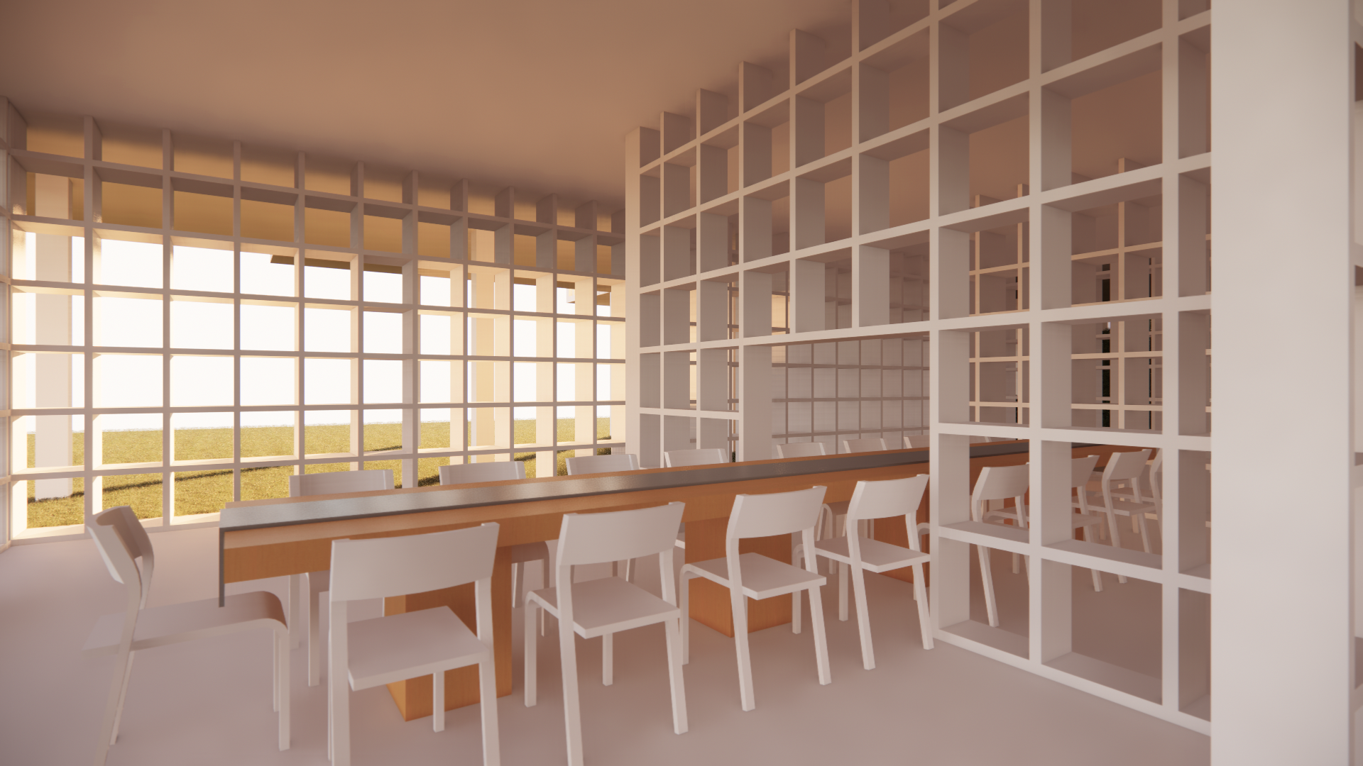 modernist interior shot this is teahouse on the ground level pls add some things on the grid part the grid are all shelfs for people to leave something here architecture