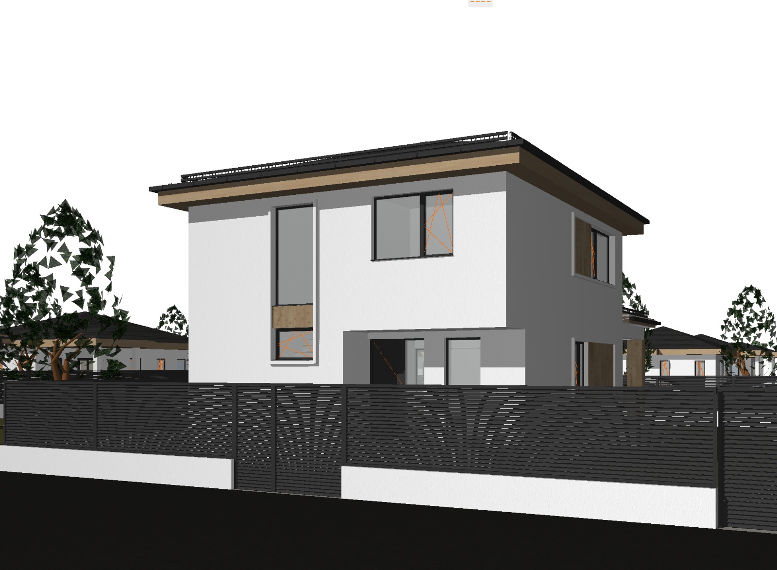 create a realistic architectural rendering of the house using a cool daylight atmosphere with subtle architectural fa ade lighting the fa ade should include scandinavian style natural wood cladding white decorative plaster and black grille accents on the windows and fence but make sure the grilles are not overly emphasized add vegetation and a few people inside the courtyard for realism and scale