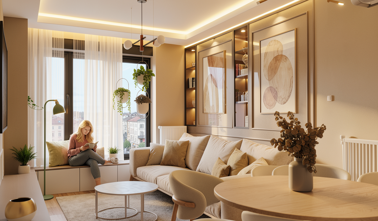 led lighting in the lowered section of the ceiling emits light inward there is also led lighting under the upper kitchen cabinets as well as inside the cabinet with glass doors the glass doors have a black frame with transparent bronze tinted glass the colors are warm and soft and the entire space conveys a sense of homely warmth the view from the window looks out onto the buildings across the street the apartment is located in the vo dovac area of belgrade on the second floor add a blonde girl sitting on the window bench getting ready to read a book while having coffee the curtains consist of a non transparent layer without color and a sheer white layer the colors off furniture and walls are beige sand cashmere everything is light and cozy in the frames upside sofa are paintings like in the sketch floor lamp is green and dining table is light oak without shelves beside painting it is flat wall