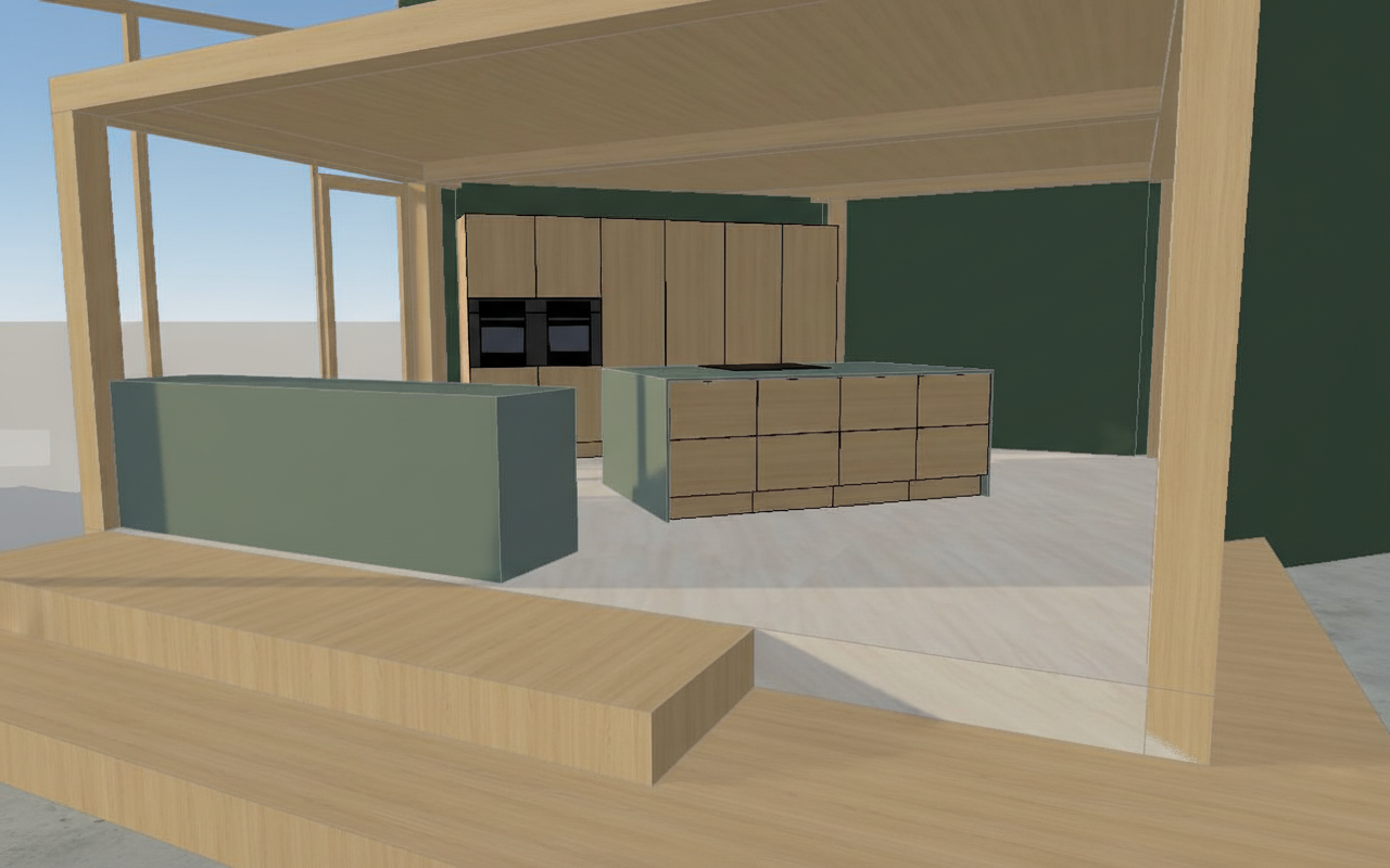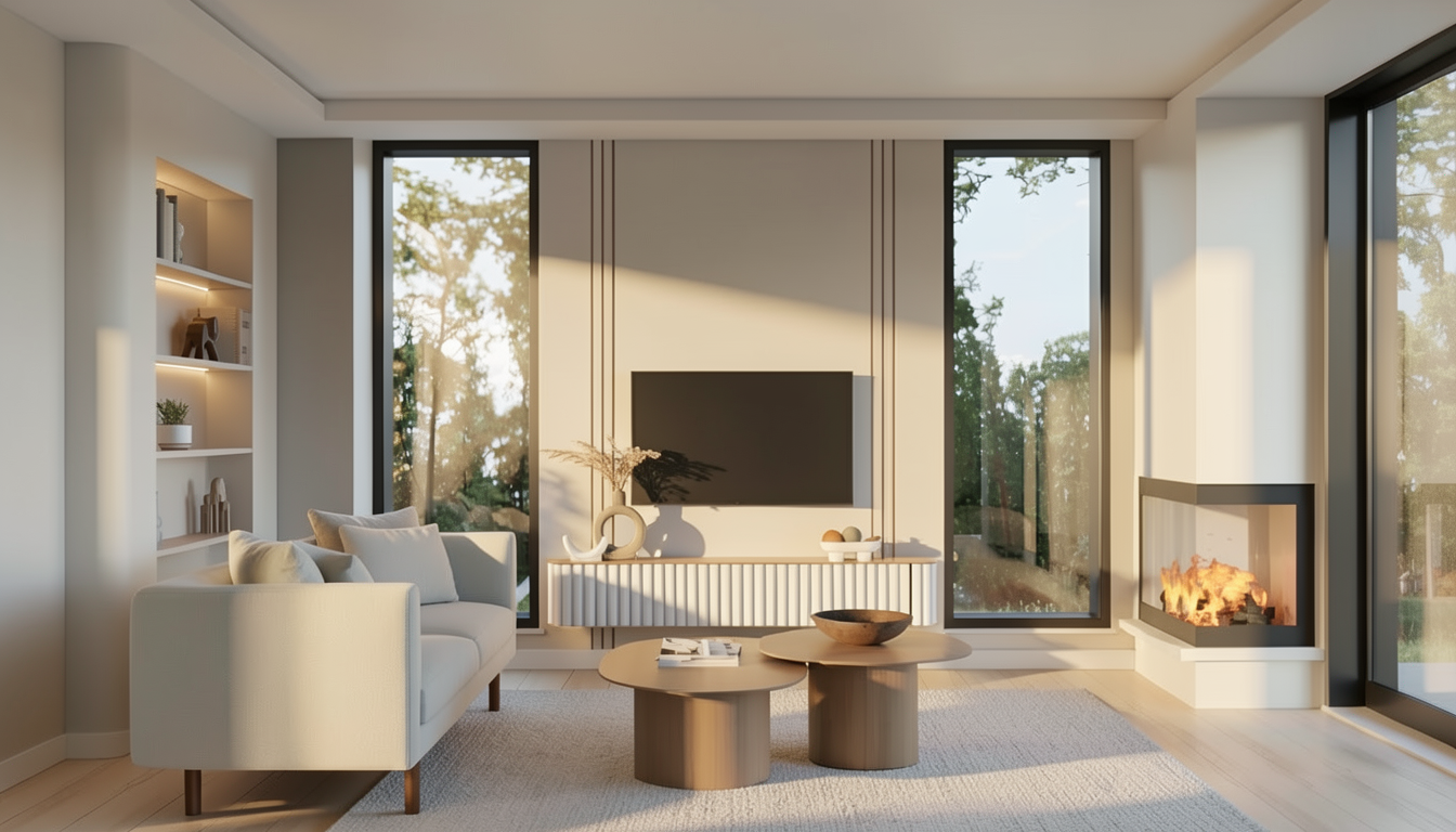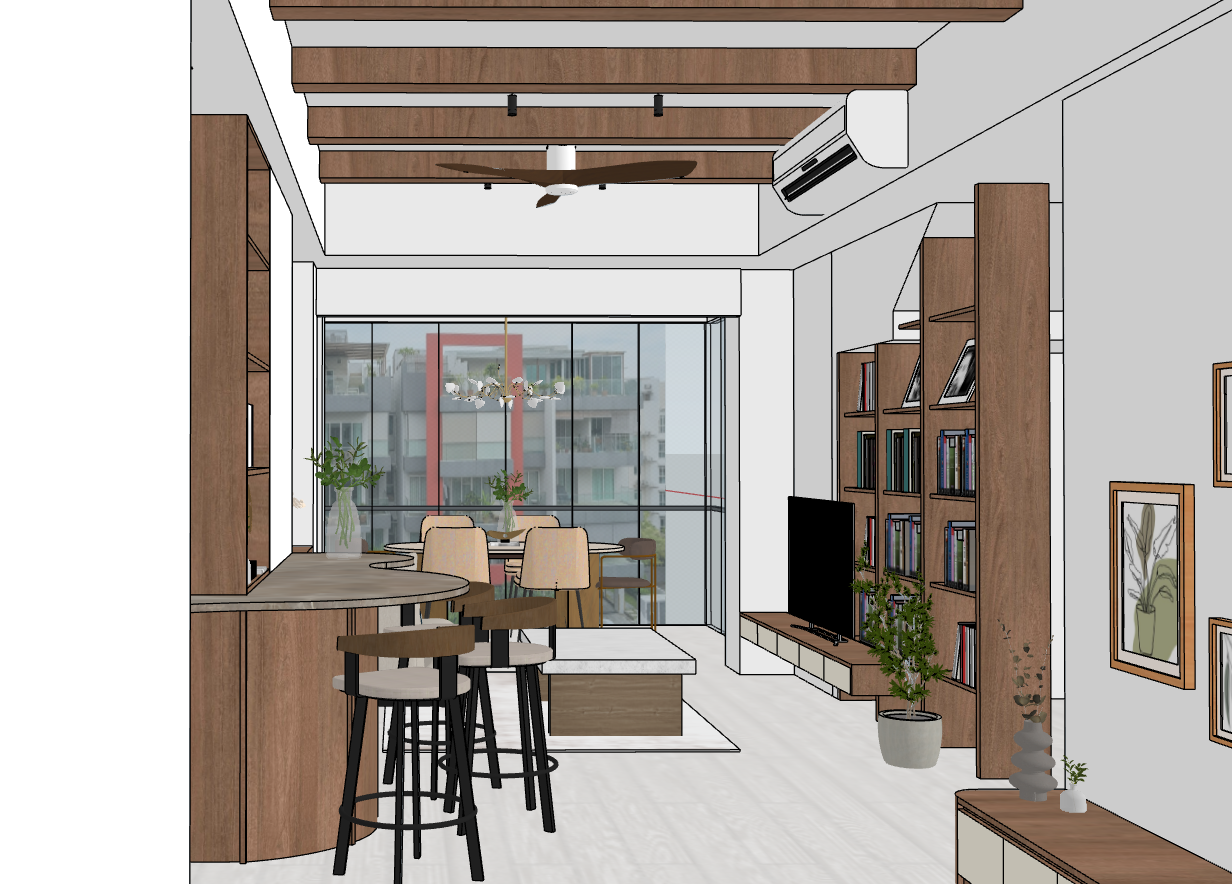 a cozy modern living and dining area with a warm inviting atmosphere the wooden ceiling beams and furniture are in rich chestnut brown creating a rustic feel the walls are painted in soft off white enhancing the spaciousness large floor to ceiling windows allow natural light to flood in the bar stools feature sleek black legs and beige cushions adding a touch of elegance the floor is white with woode pattern lush green plants bring freshness and life to the room the ambience is calm and welcoming perfect for relaxation or entertaining