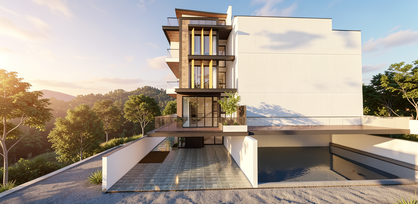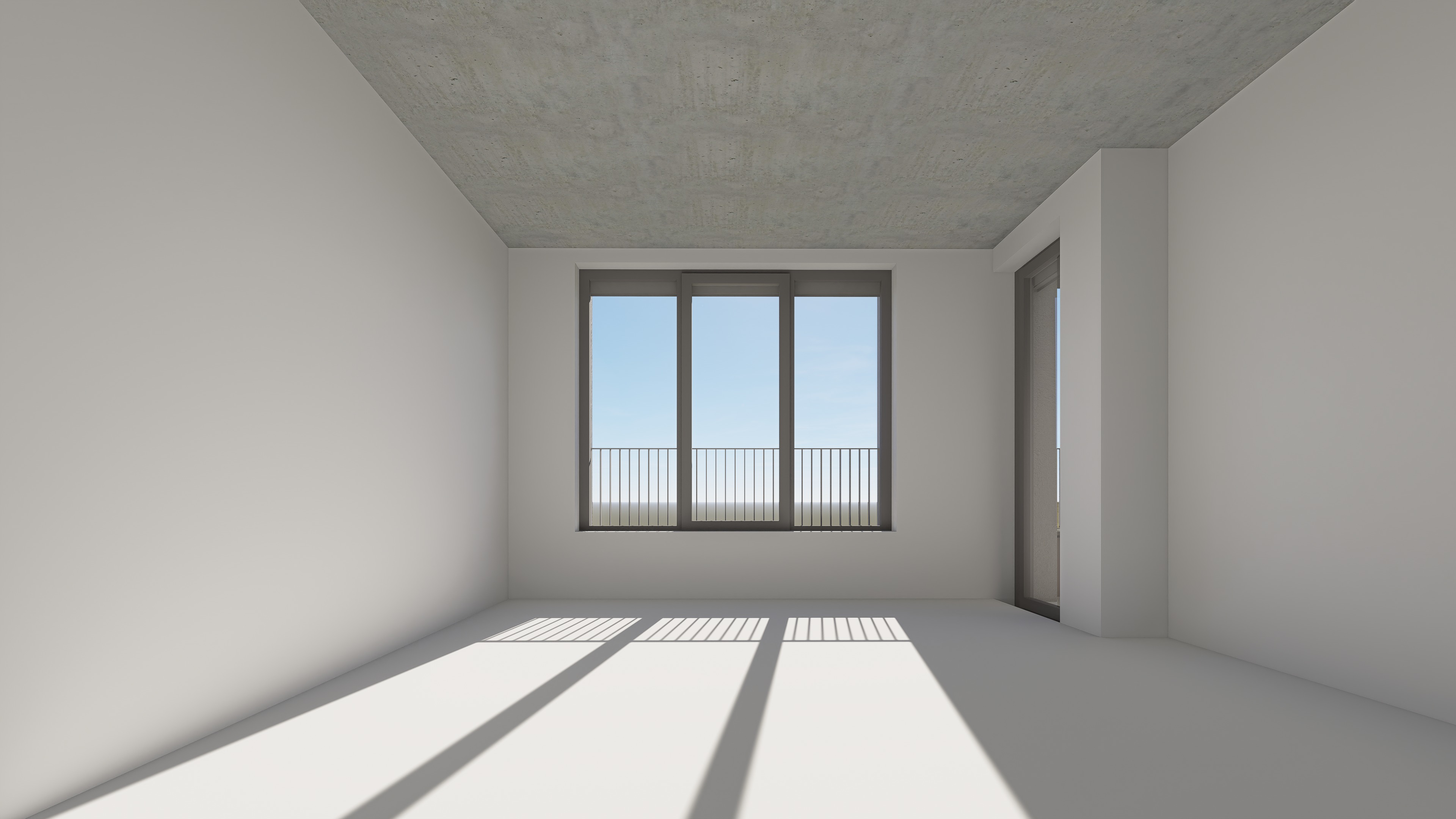 create a realistic architectural interior visualization while strictly preserving the exact camera position perspective room geometry window sizes and composition do not modify the architecture openings or layout set a warm summer sunset outside with golden sunlight entering the room through the windows and casting soft long shadows inside keep the exterior buildings and trees unchanged but adjust the lighting to a late summer evening atmosphere furnish the interior with a modern minimalist industrial style simple neutral sofa low coffee table subtle rug metal floor lamp minimal shelving and a few natural materials like wood and metal maintain a calm clean aesthetic with soft realistic materials warm light reflections and natural shadows so the space looks like a real photograph