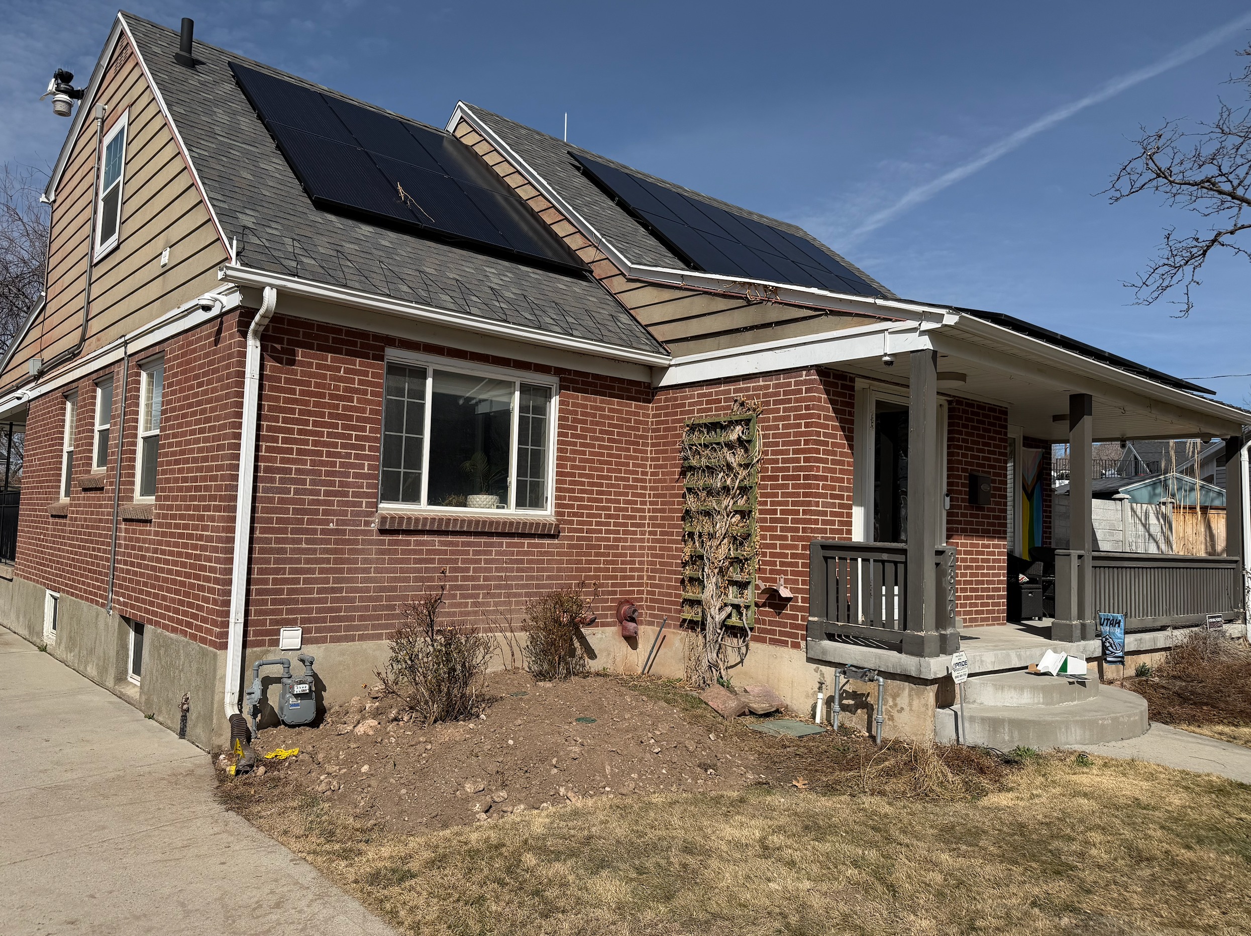 revision prompt do not alter architecture maintain the exact original house do not change brick roof porch structure proportions or solar panels corrections brick restore all existing red brick exactly as in the original photo siding is only above the brick line do not apply siding over brick siding apply plank fiber cement cedarmill 8 25 inch horizontal lap siding in night gray only on the upper gables and areas currently siding above brick cool charcoal gray tone clean modern finish fascia soffit gutters window trim and window frames change all white trim and window frames to plygem mastic dark bronze j5 metal very dark bronze almost brown black matte finish deep rich not reddish brown window frames must match the fascia and gutters exactly no white visible shutters replace shutters with simple shaker style shutters flat panel minimal detail same dark bronze j5 color proportioned correctly to windows railing and porch posts warm smoky brown wood stain muted brown not orange not red cedar more walnut toned matte natural wood finish modern square profile landscaping millcreek utah climate appropriate add fresh green lawn structured foundation planting boxwoods ornamental grasses small hardy shrubs clean mulch beds defined edges frame the house without covering brick overall look modern traditional balanced contrast dark trim crisp against brick refined curb appeal photorealistic daylight do not reinterpret colors keep original camera angle