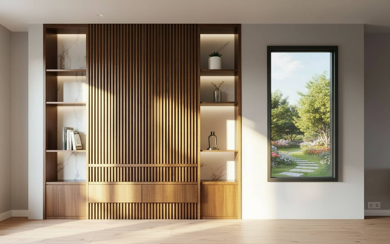 behind the shelves make them white and the big fluted wooden wall between the shelves make it plain white