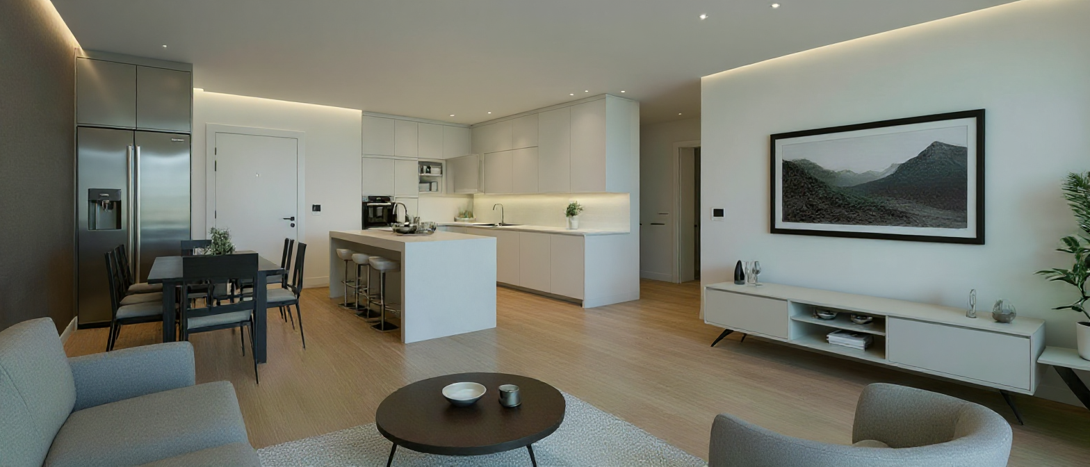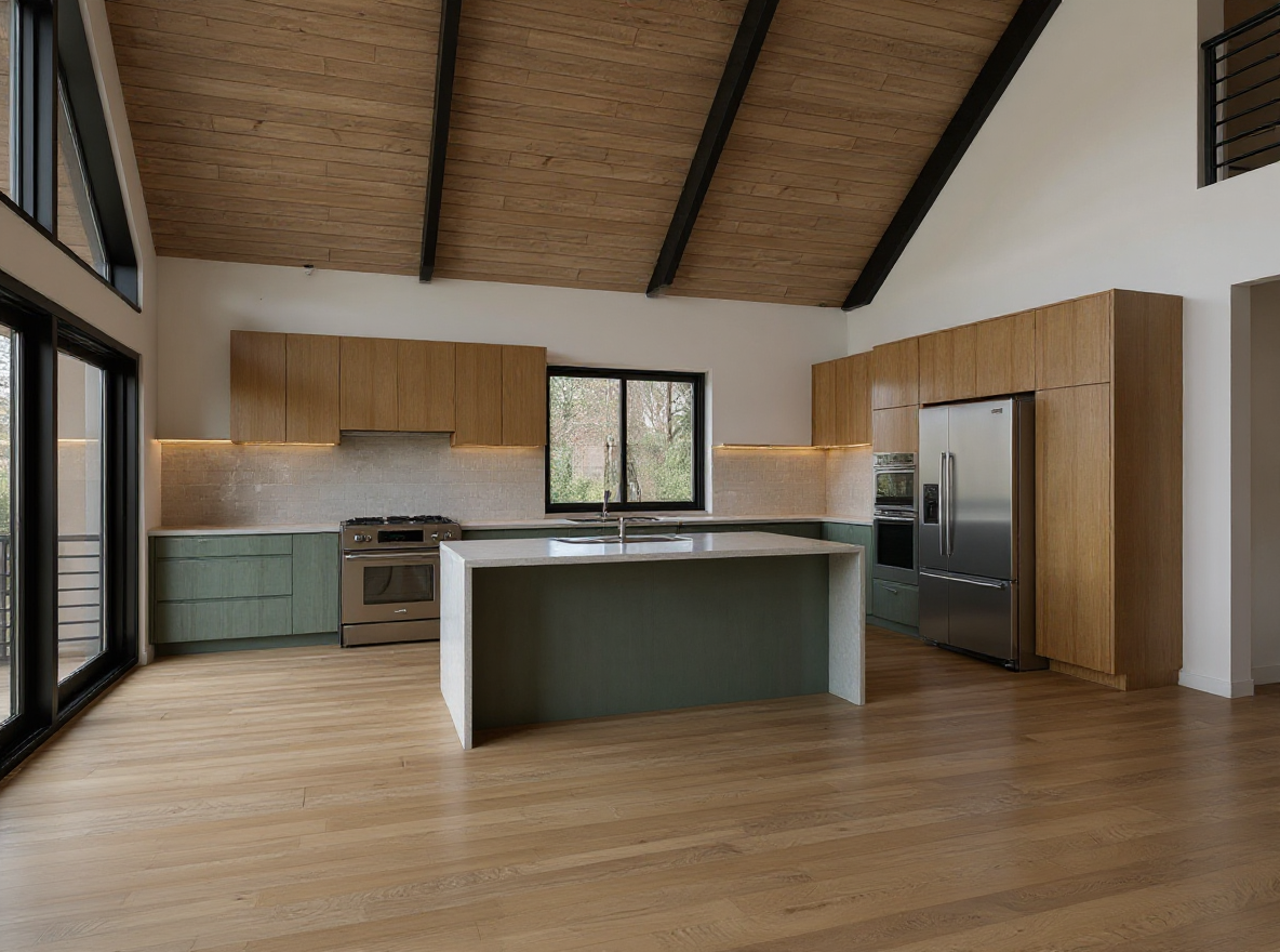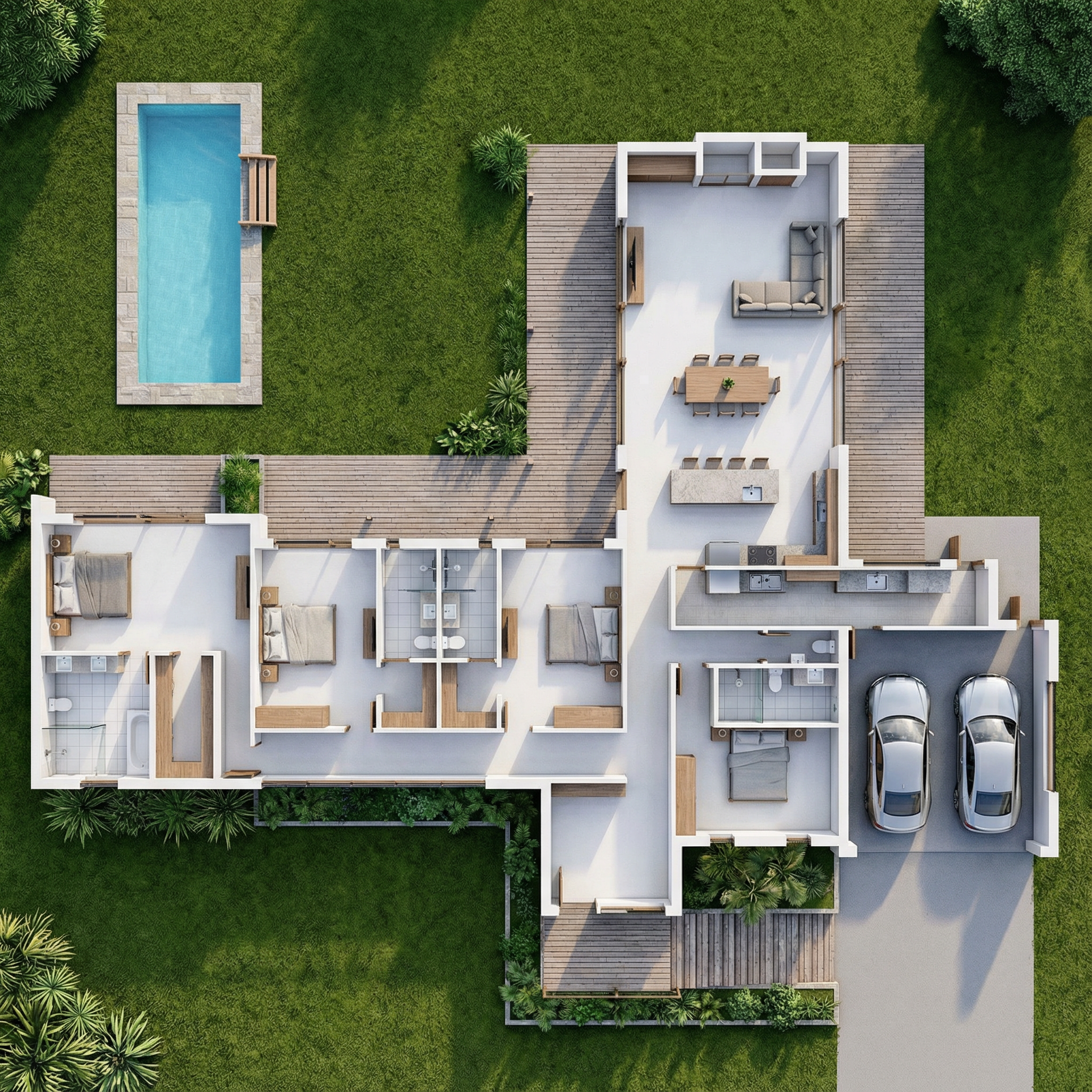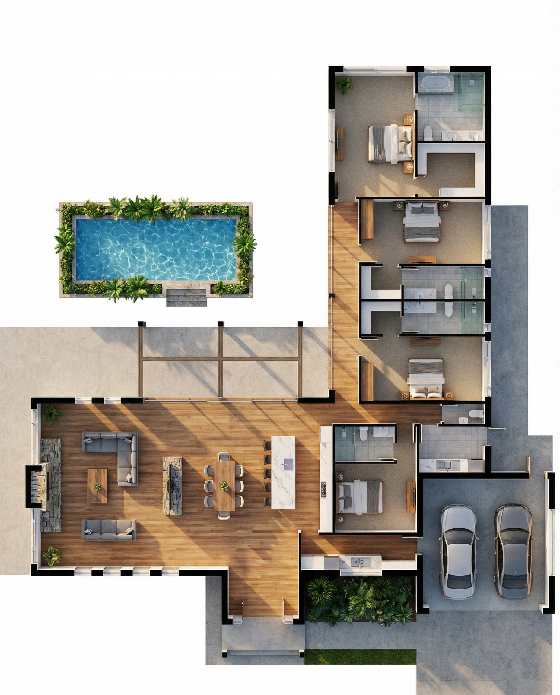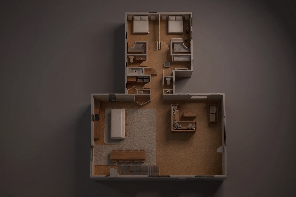 render a clean black and white architectural 2d floor plan in a professional construction document style use thick exterior wall lines and thinner interior partition lines add crisp furniture symbols with light shading and fine hatching include door swings plumbing fixtures cabinetry and beds shown in top view use a soft concrete textured background with a slightly aged grayscale tone add subtle drop shadows around walls and furniture for depth while keeping the drawing technical and flat