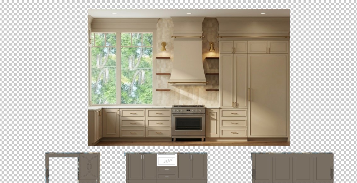 use reference image keep exact cabinet color and design warm taupe painted island cabinetry with inset panels aged brass hardware blue natural stone countertop high movement natural veining polished fluted decorative legs on back of island the countertop will also have a curved over hand about 8 out on the back detailed applied molding on island sides high end traditional kitchen realistic materials soft daylight warm shadows photorealistic render architectural interior