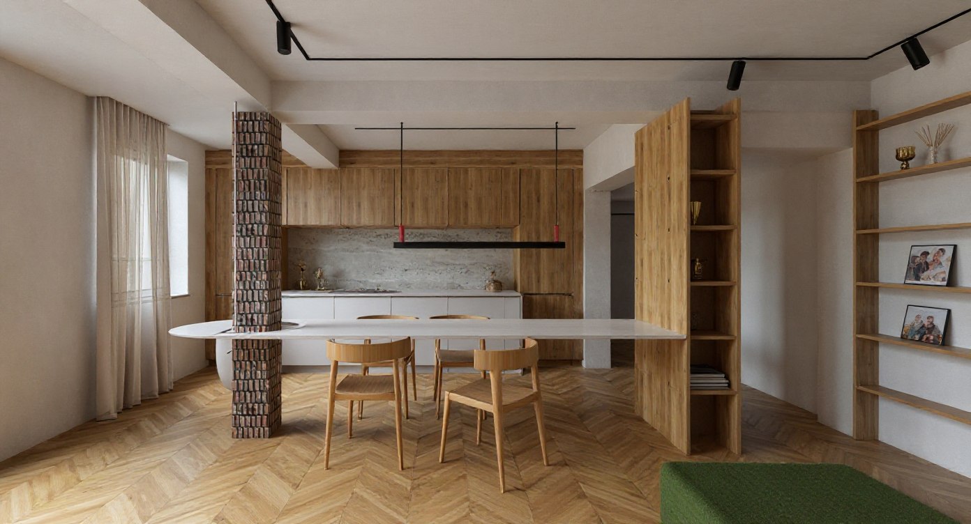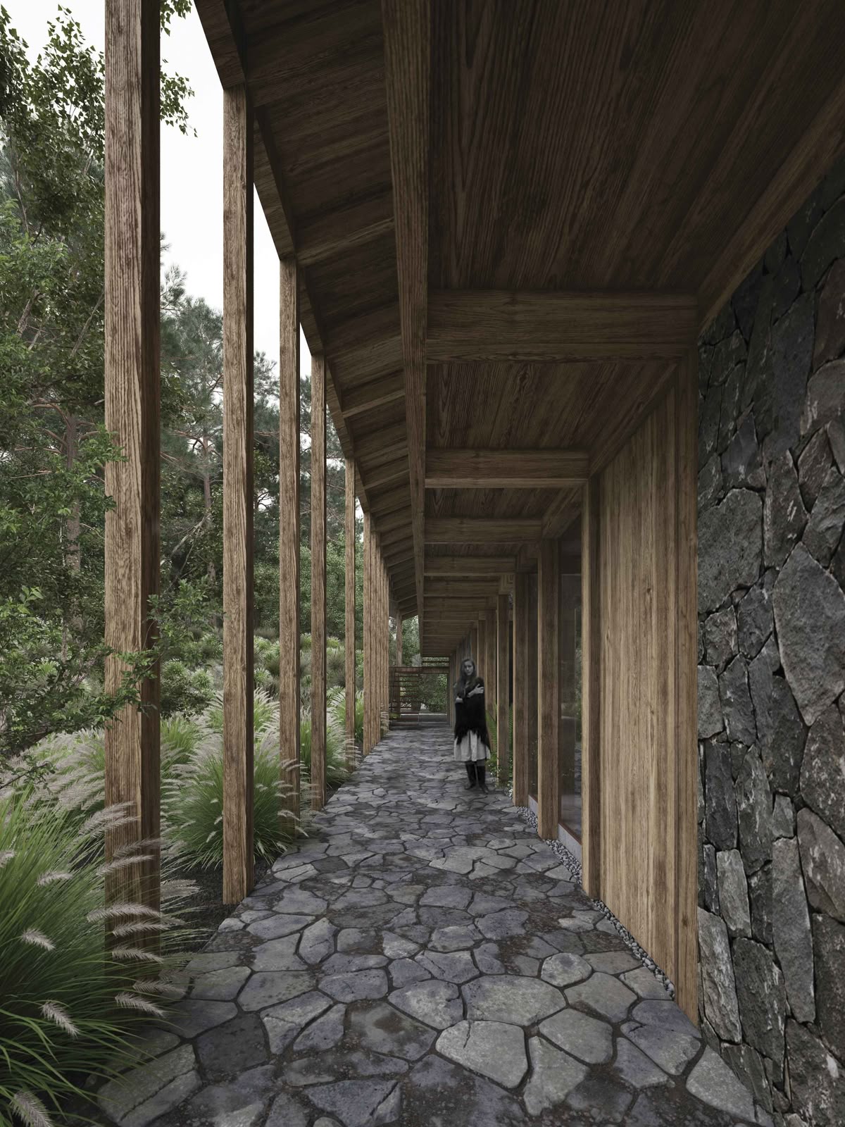 change the right side landscape to lush rice fields change the flooring material to horizontally oriented wooden decking there is a 20cm gap between the deck and the stone wall on the right through which the rice field is growing out
