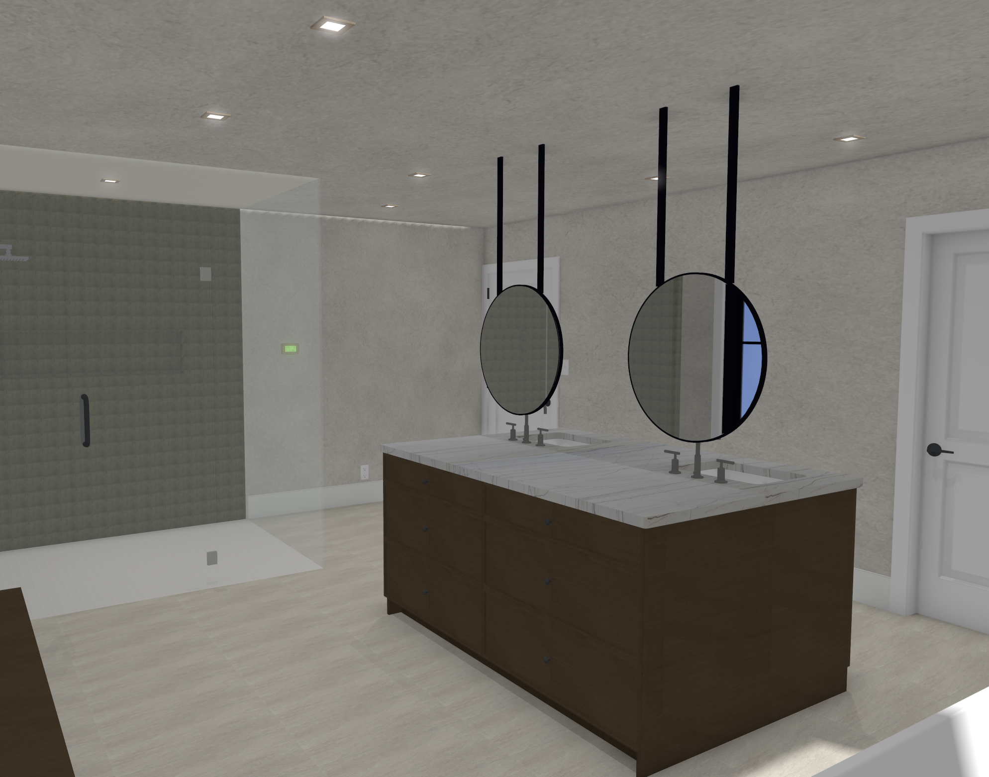 walls will be a griege plaster cabinets and bench will be red oak cabinets in raw umber stain flooring will be akdo primal in color sand countertops willl be seal pearl quartzite