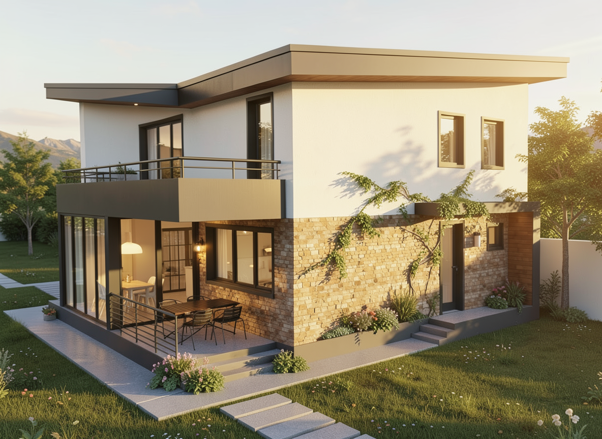 create photorealistic view building color is off wihite ral9010 facade material is plaster make rounded skylight more transparent and shiny