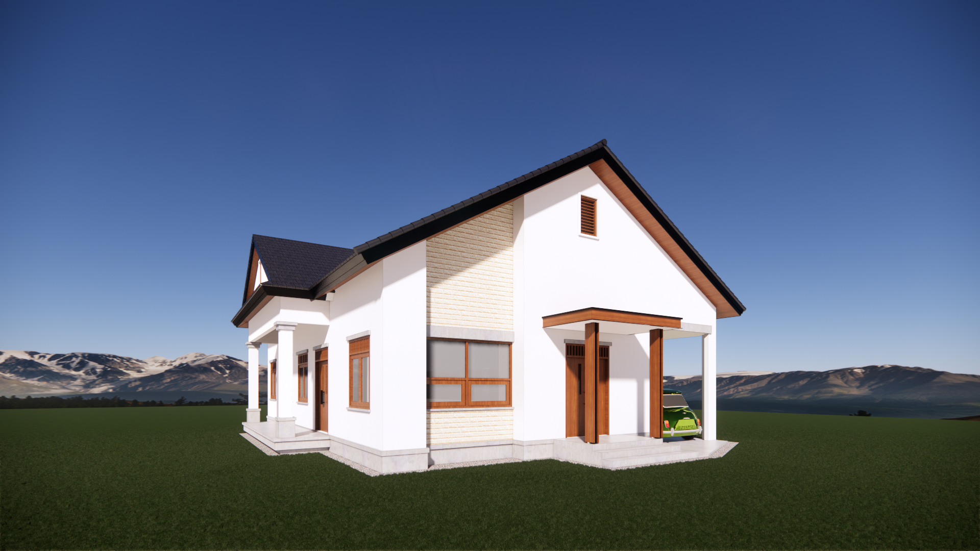 clear skies trees and mountains in the background