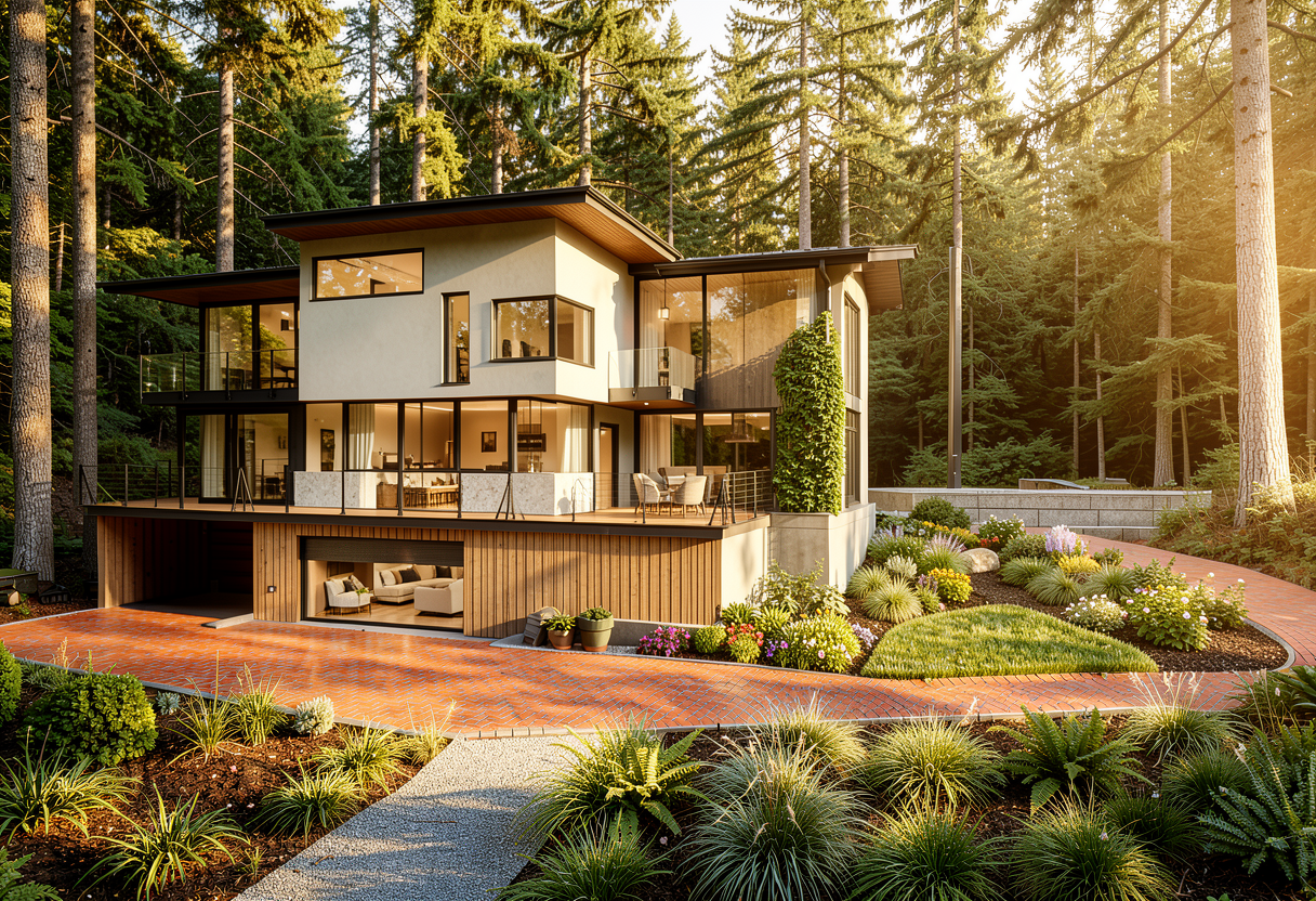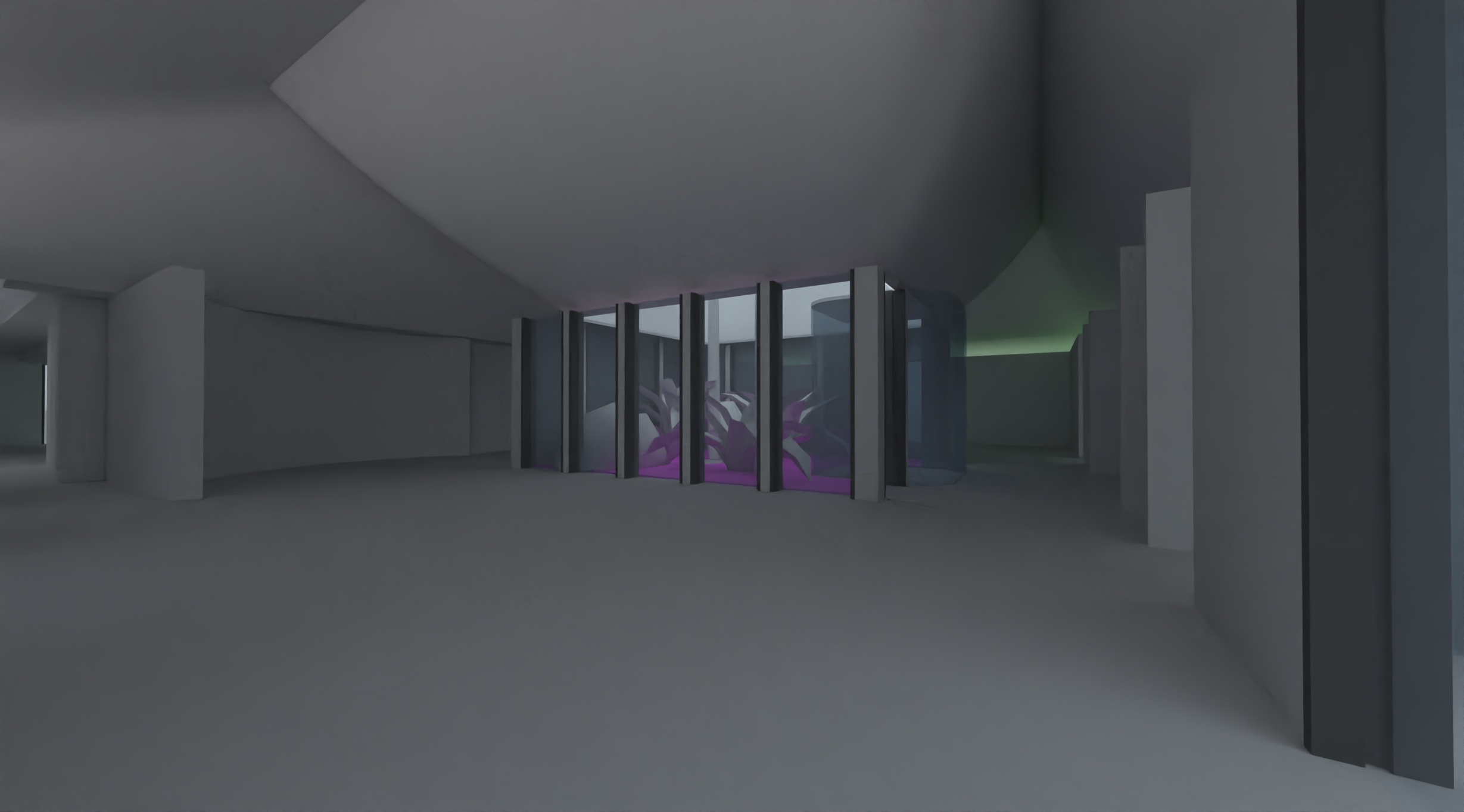bright walk in closet with minimal architecture central enclosed glass orchid pavilion integrated into the space circulation around the glass volume terrazzo border flooring with carpet inset very light neutral materials strong natural daylight minimal furniture for scale airy and luminous atmosphere