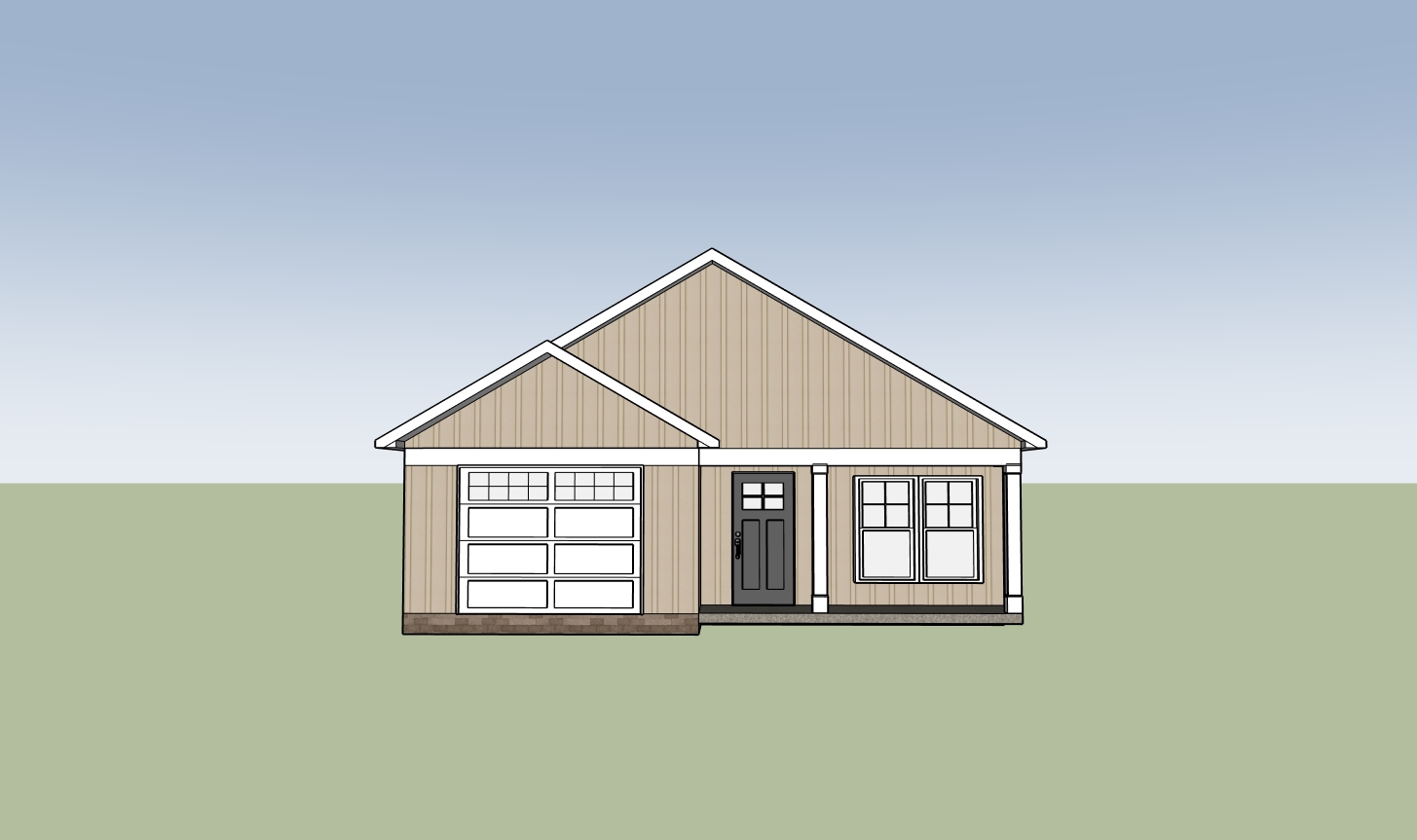 a manicured lawn layered flower beds low maintenance shrubs native plants concrete pathway leading to the entrance from left side driveway in a neiighborhood with other same size houses board and batten siding with brick on foundation white porch posts with painted gray door show trees in the distance behind the house