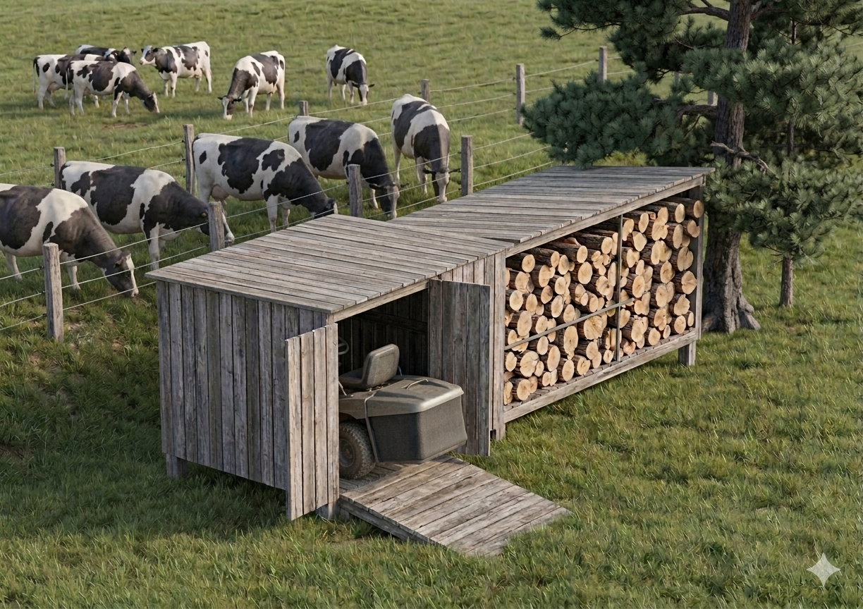 remove the lawn tractor in the shed add a man chopping wood on the right side remove the tree on the right and replace it with a bush add a man driving a lawn tractor into the shed door entrance from outside shed should be higher than the people