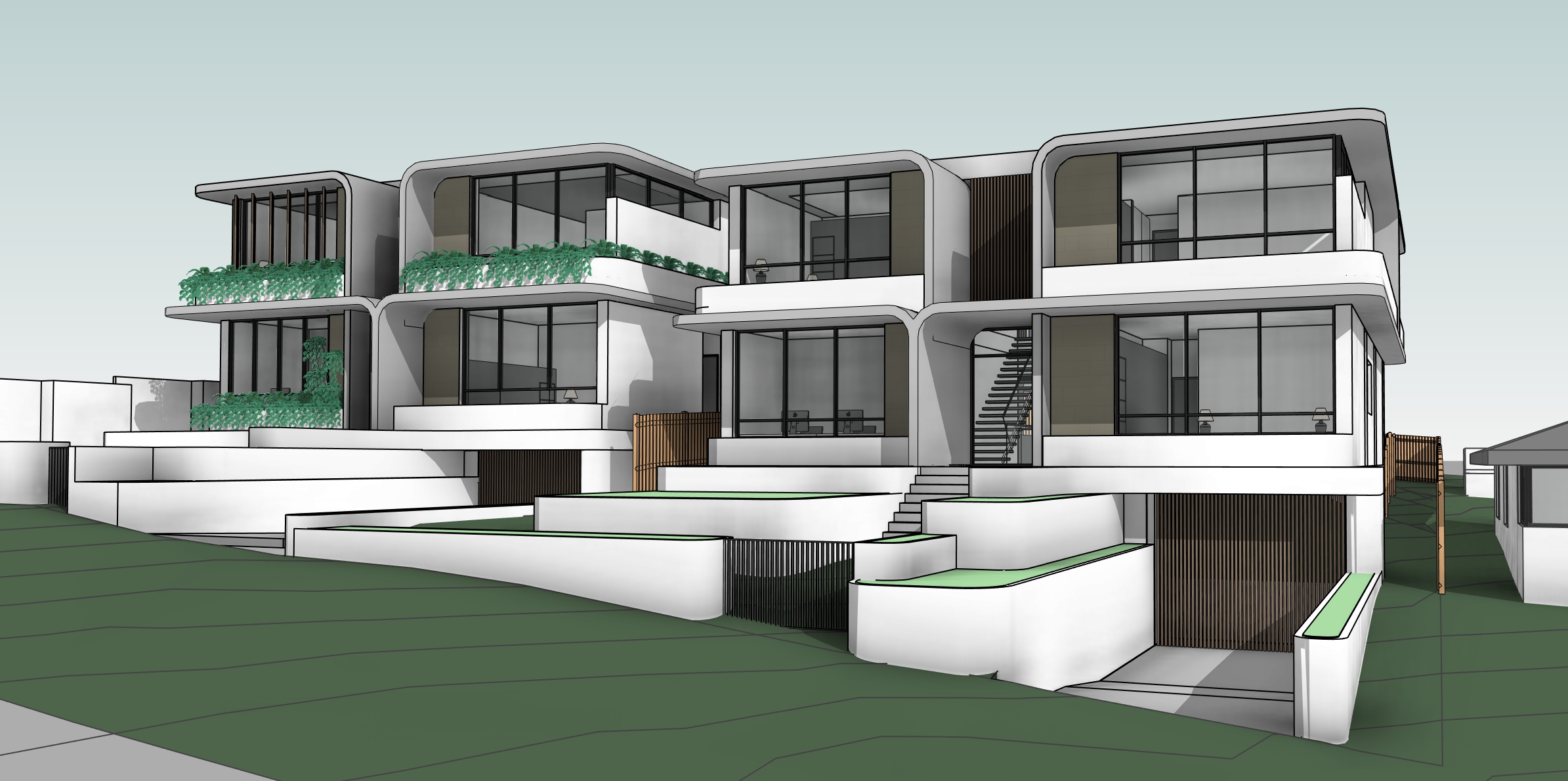 exterior shot a modern two story house with large windows and clean lines the exterior features light beige brickwork and smooth white stucco large glass windows accentuate the design framed in matte black the landscaping includes lush green shrubs and climbing plants adding a fresh touch the roof is flat with a subtle overhang providing shadow and depth the atmosphere is serene and contemporary on a sunny day with the light reflecting gently off the surfaces colors light beige white matte black lush green