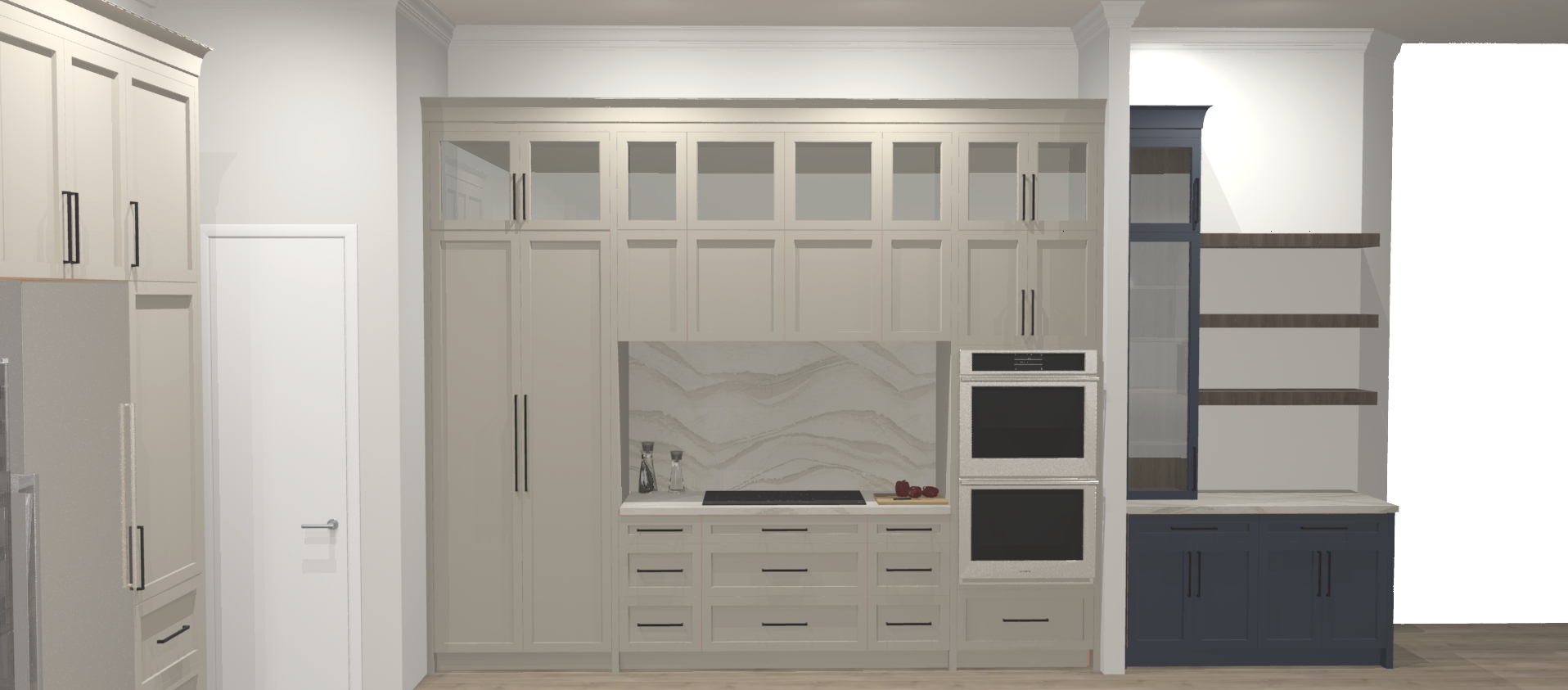 add led strips on ofloating shelves and led strip on sides of tall blue cabinet place liquir bottles on shelves inside tall glass cabinet