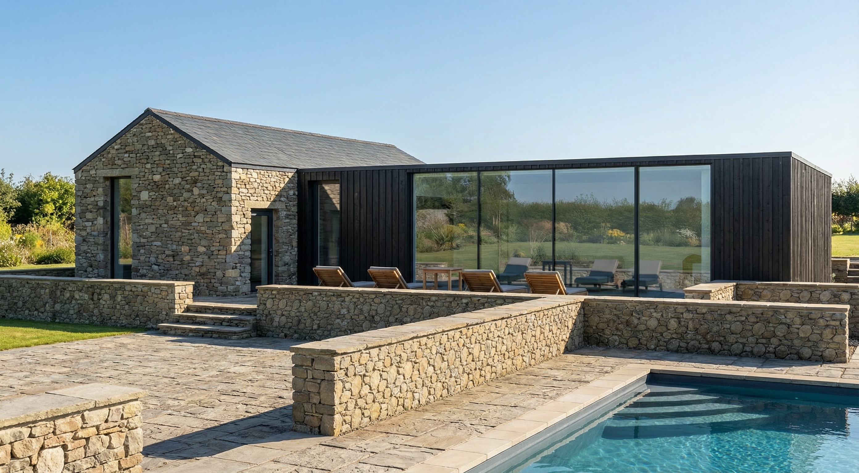 a pool house made from stone and black vertical timber cladding set within a paved garden ultra realistic render