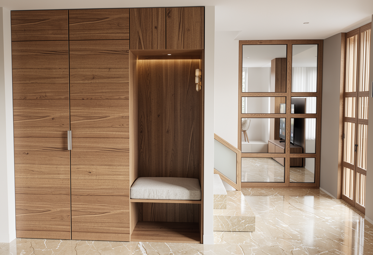 render a modern two story house on a sloped landscape the building features a geometric facade with vertical wood siding raised metal roof casement windows use soft white for the walls to create a clean contemporary look highlight the windows with reflective glass for a realistic effect the sloped driveway should be a muted gray complementing the lush wild grass surrounding the property add a wooden fence on the left for an earthy contrast include detailed leafy trees in the setting casting gentle shadows on the house capture the scene under a bright blue sky with soft natural lighting for a serene and inviting atmosphere