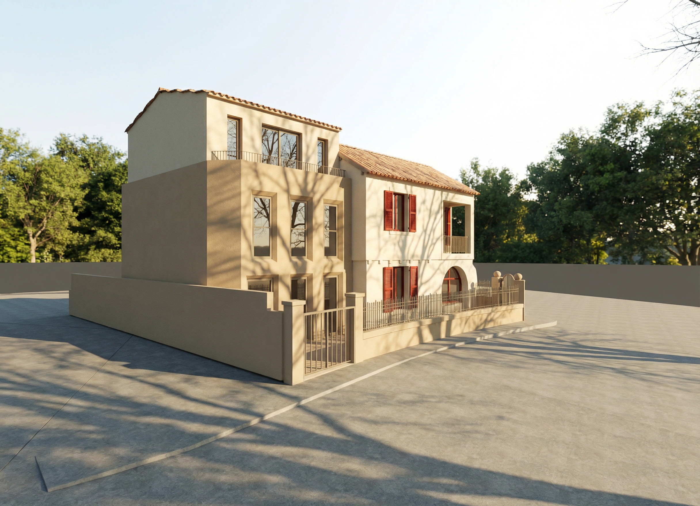lot of reflects and sun light the sun illuminates the facade that we see some trees in the background facade more in the light more reflect all is painted no stone the fence call is beige like the extension more shadows of trees on the facade my point of view more lighter more tree shadows on the facade different color on each part of the house the color of the shutters are red only on the right part of the house