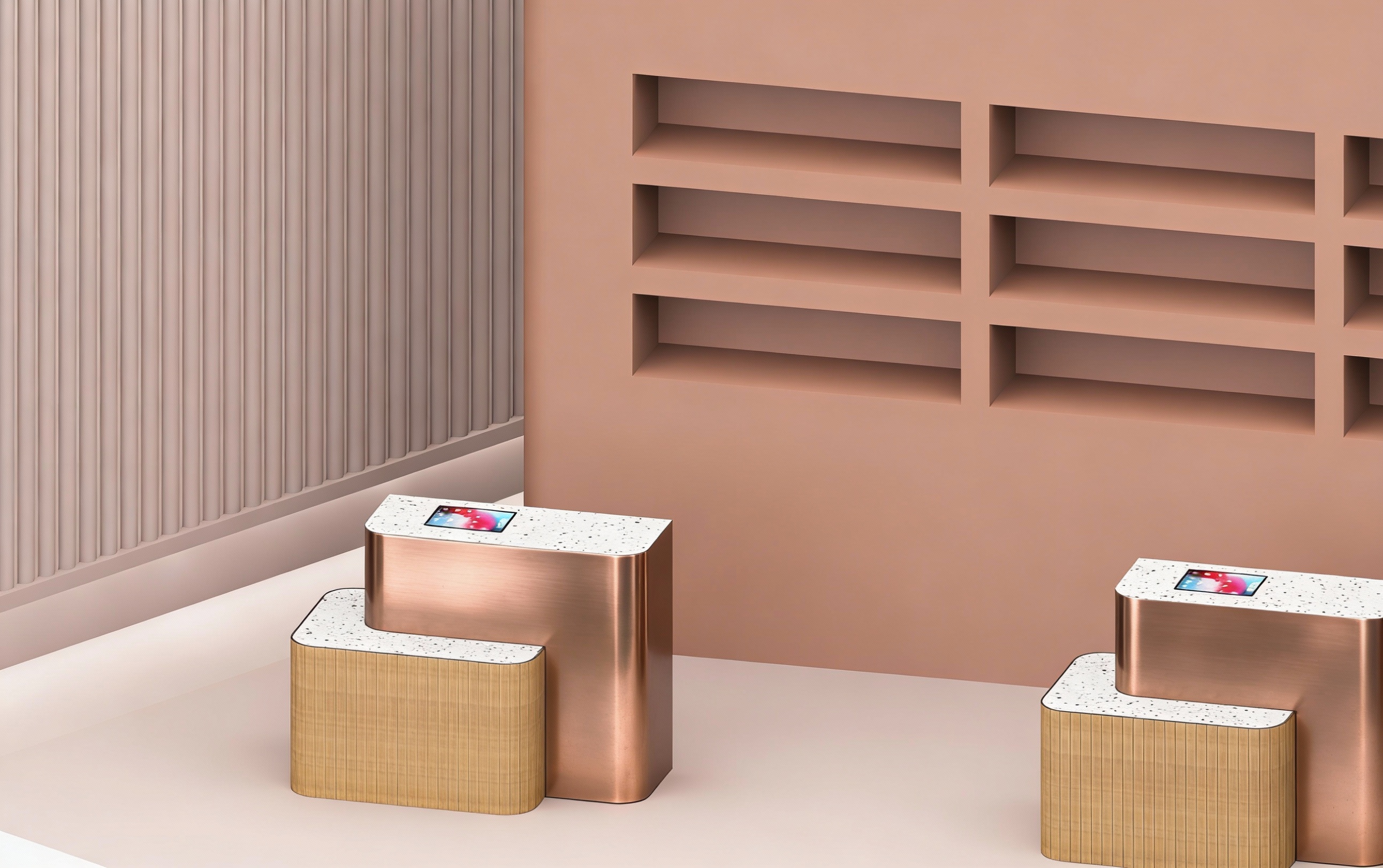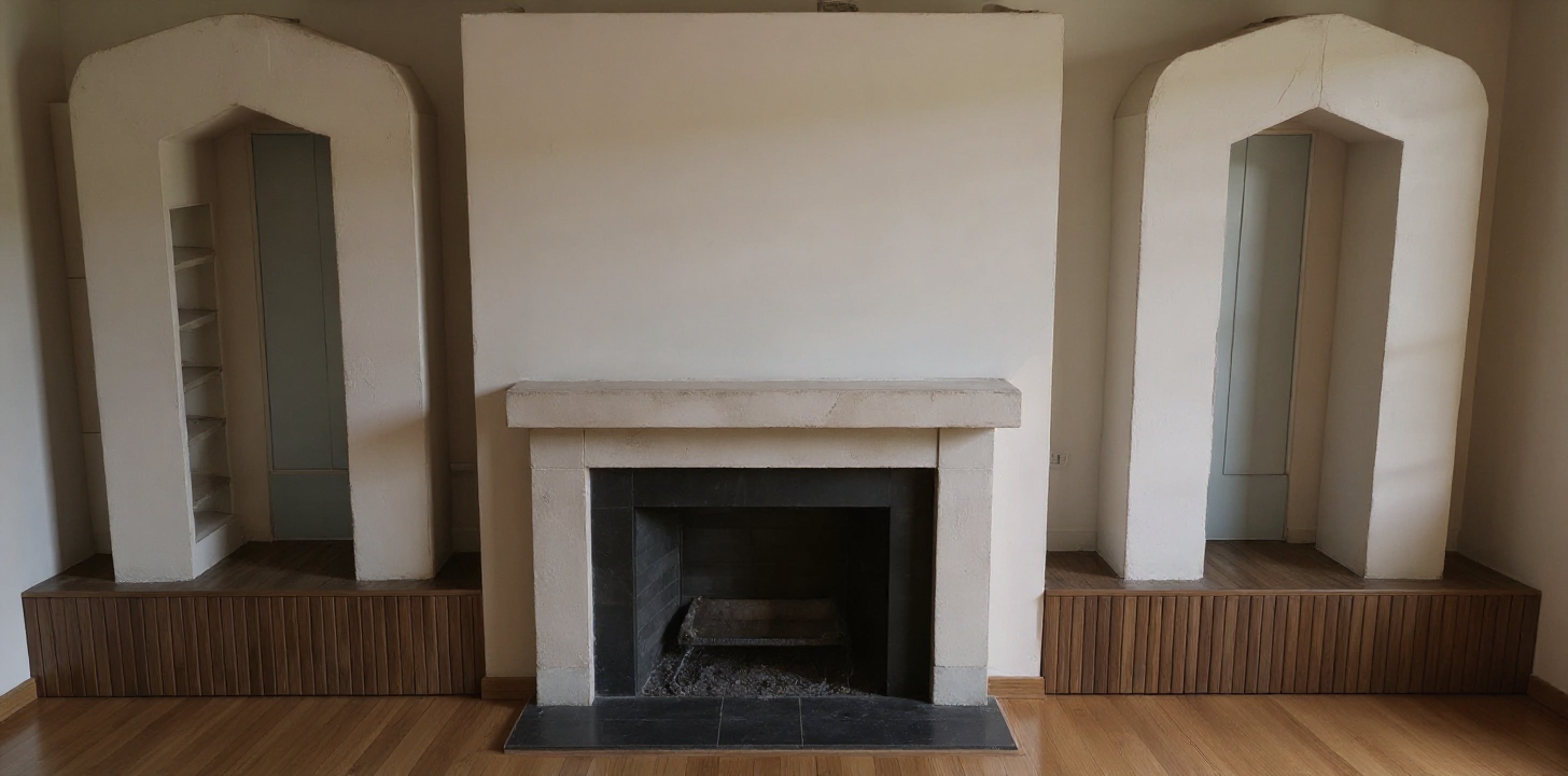 add some decorations to the empty shelves near the sofa two cushions on the sofa a terrace with a small town behind the patio door and rays of sunlight inside maintain colors and textures precision