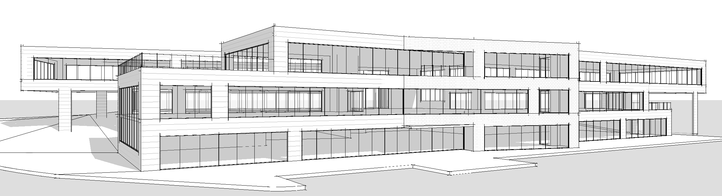 minimalism exterior shot desert modern office building in cedar city utah with sandstone cladding and a sunrise sky add people and xeriscaping architecture