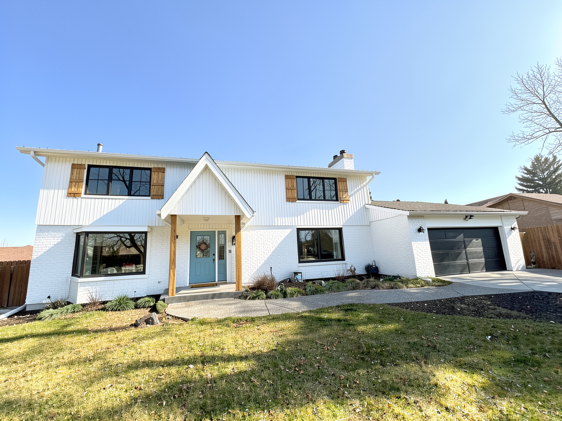 replace the bay window on the west side of the house to be a flush picture window replace wooden shutters with a cheveron wooden shutter add shutters to all windows make the front entry wooden posts slightly larger