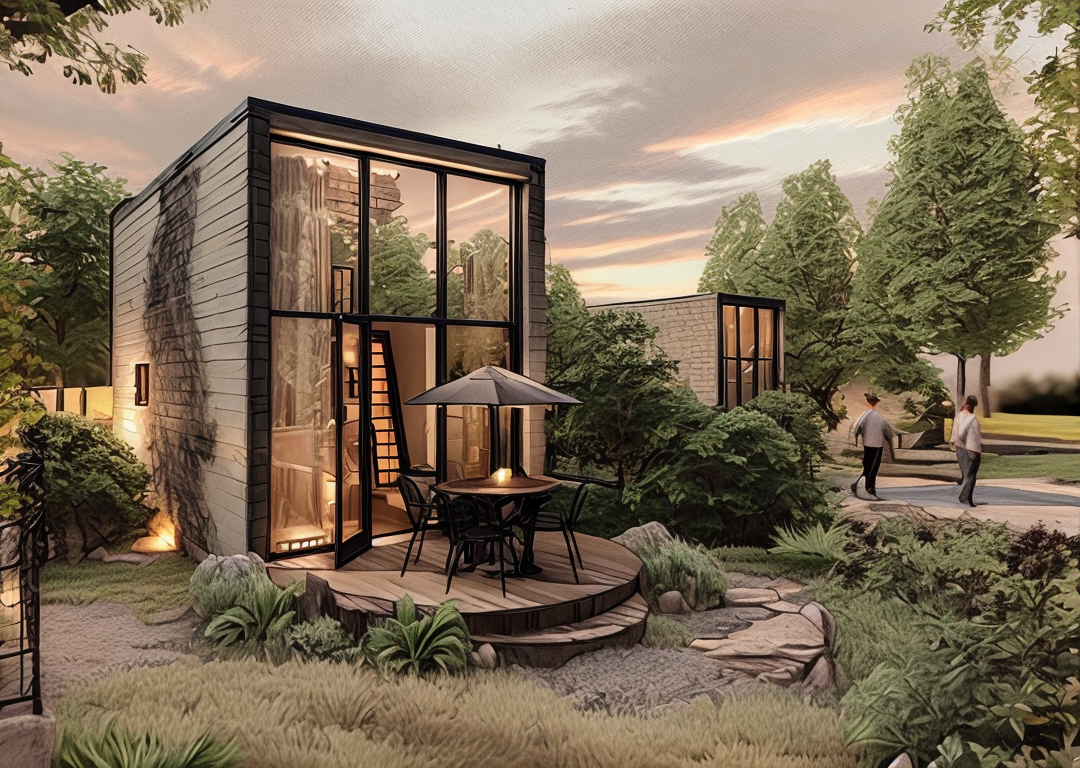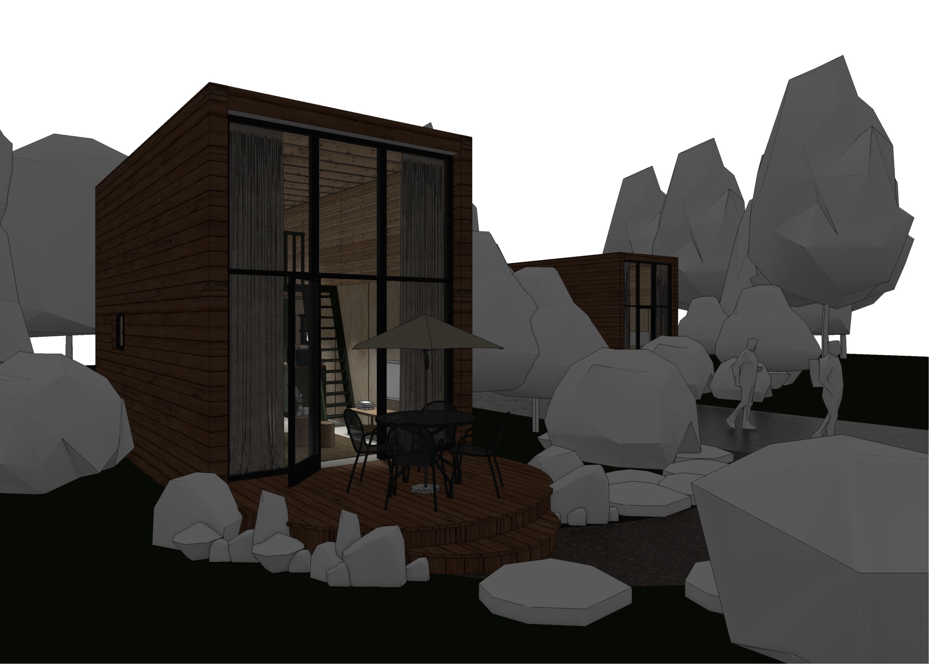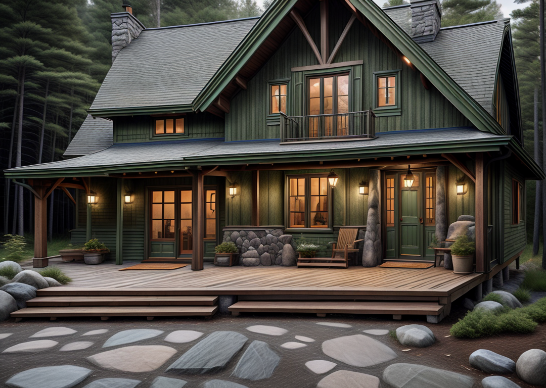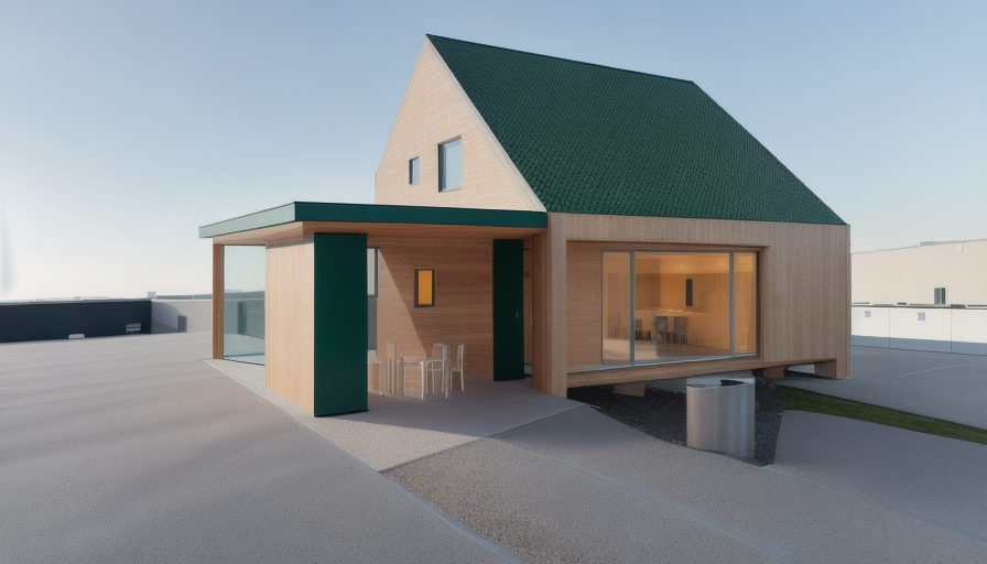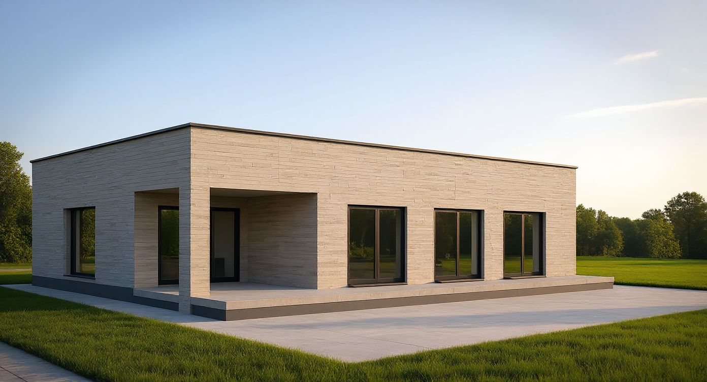 exterior shot chanche the atmosphere to the moodboard but keep the design of the building enhance the clarity and texture of the stone facade and the large glass windows add realistic lighting effects including soft natural sunlight that highlights the architecture include well maintained landscaping with lush grass additional trees and subtle shadowing from the building and surrounding trees adjust the sky to a bright clear day to give a vibrant yet polished atmosphere refine the reflections on the windows to enhance the depth and dimension of the glass making the overall scene look more immersive and lifelike change the wooden exterior to the stone from the moodboard