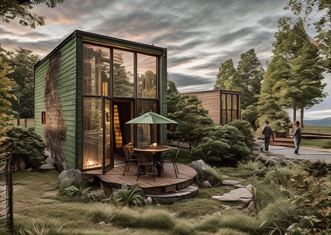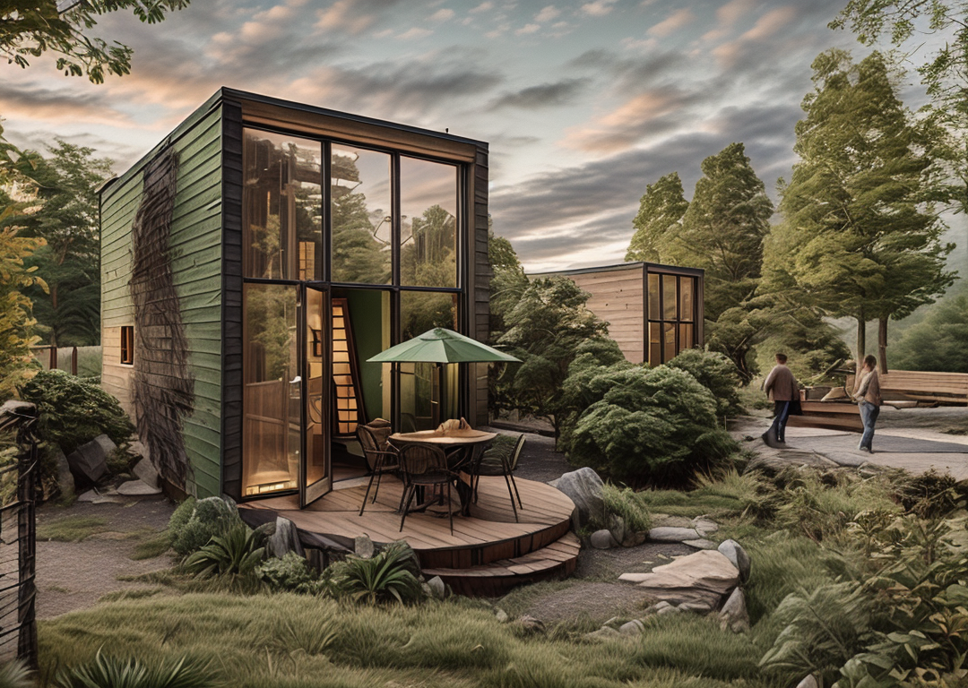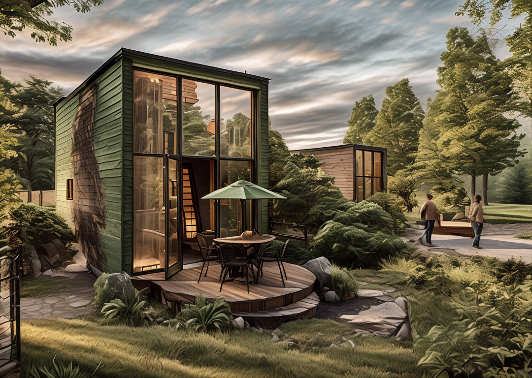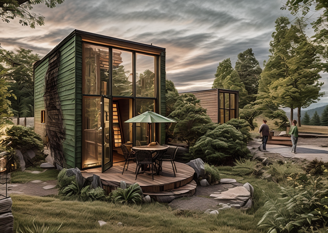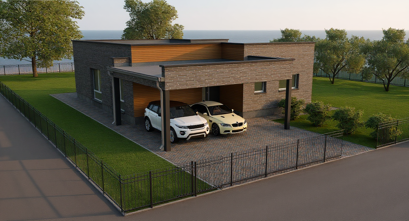 exterior shot chanche the atmosphere to the moodboard but keep the design of the building enhance the clarity and texture of the stone facade and the large glass windows add realistic lighting effects including soft natural sunlight that highlights the architecture include well maintained landscaping with lush grass additional trees and subtle shadowing from the building and surrounding trees adjust the sky to a bright clear day to give a vibrant yet polished atmosphere refine the reflections on the windows to enhance the depth and dimension of the glass making the overall scene look more immersive and lifelike change the wooden exterior to the stone from the moodboard
