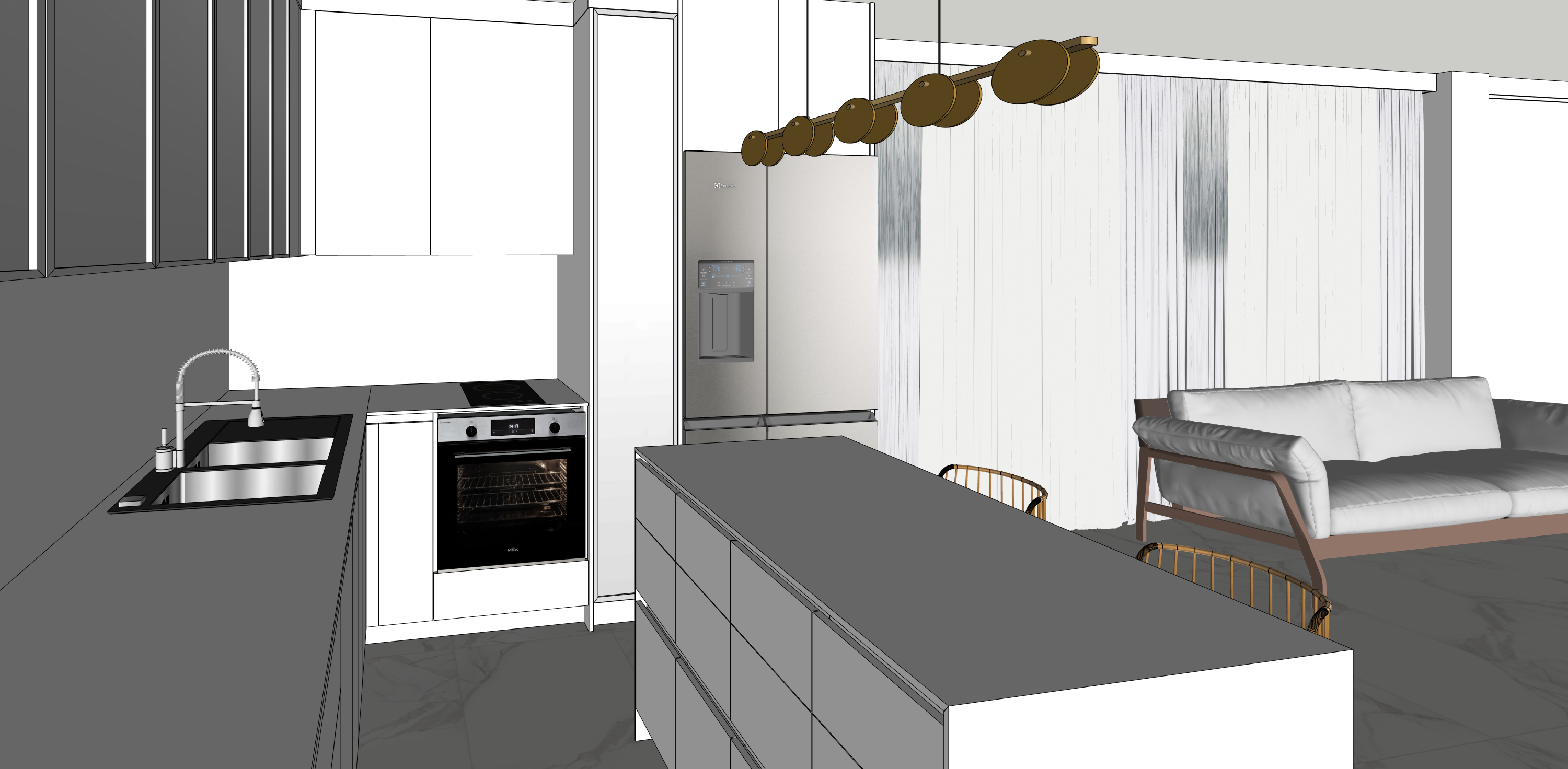 photorealistic modern european open plan kitchen and living room interior preserve the exact architecture kitchen layout island position and appliance locations from the sketchup scene kitchen configuration must remain unchanged l shaped kitchen with a central island and two bar stools refrigerator on the right wall next to the cooktop and built in oven sink along the window wall interior design style modern warm minimalism with high end european aesthetic kitchen materials light beige matte cabinetry natural oak wood accents on tall cabinets light natural stone countertop with waterfall island smoked glass upper cabinets with slim black aluminum frames floor large marble look porcelain tiles living room design large comfortable modular sofa in light fabric one accent armchair two modern round coffee tables stone and dark wood soft neutral rug tv wall minimalist floating tv console with vertical wood panel accent dining solution extendable dining table near the window for 4 6 people with elegant upholstered chairs decor and styling ceramic vases books coffee table styling plants modern artwork decorative trays soft cushions and throws lighting pendant light above the island soft ceiling lighting led lighting under kitchen cabinets and inside glass cabinets warm ambient lighting windows sheer linen curtains atmosphere warm elegant calm residential interior do not change kitchen geometry do not move appliances preserve all proportions and layout from the sketchup scene ultra realistic interior render