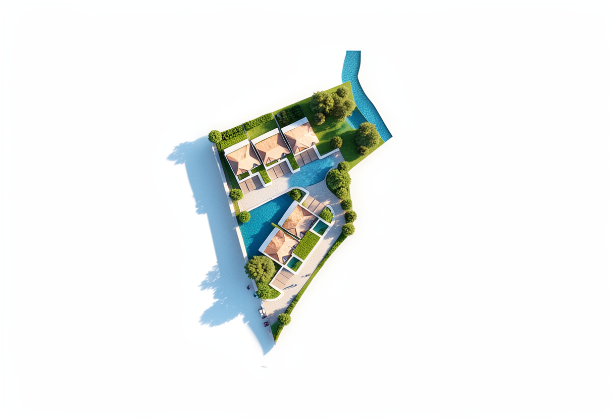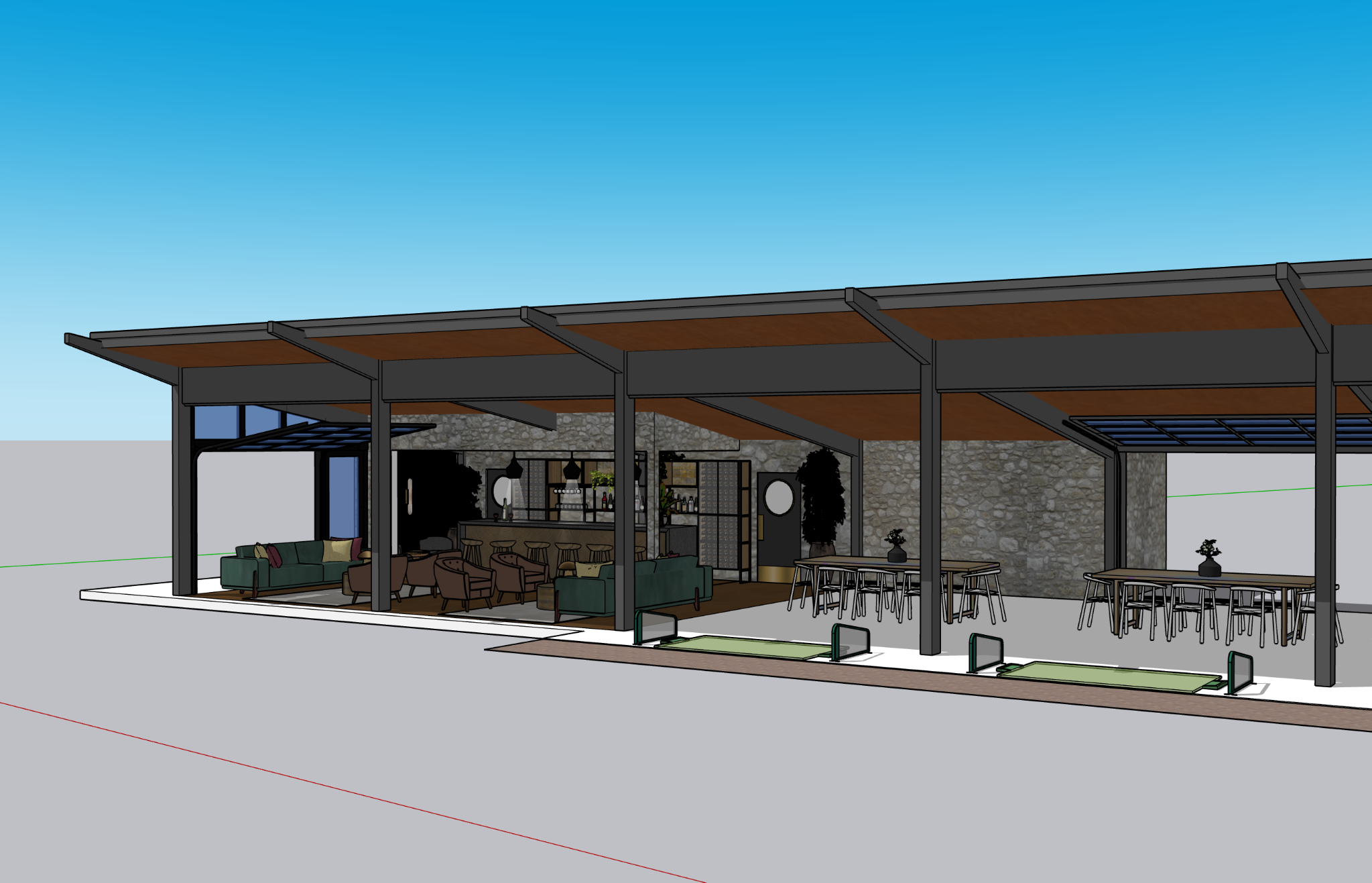 please photo realistic render the photo make it lively and have people golfing off the mat the light gray around the building and concrete should be grass the brown at the mats is to be dirt grass
