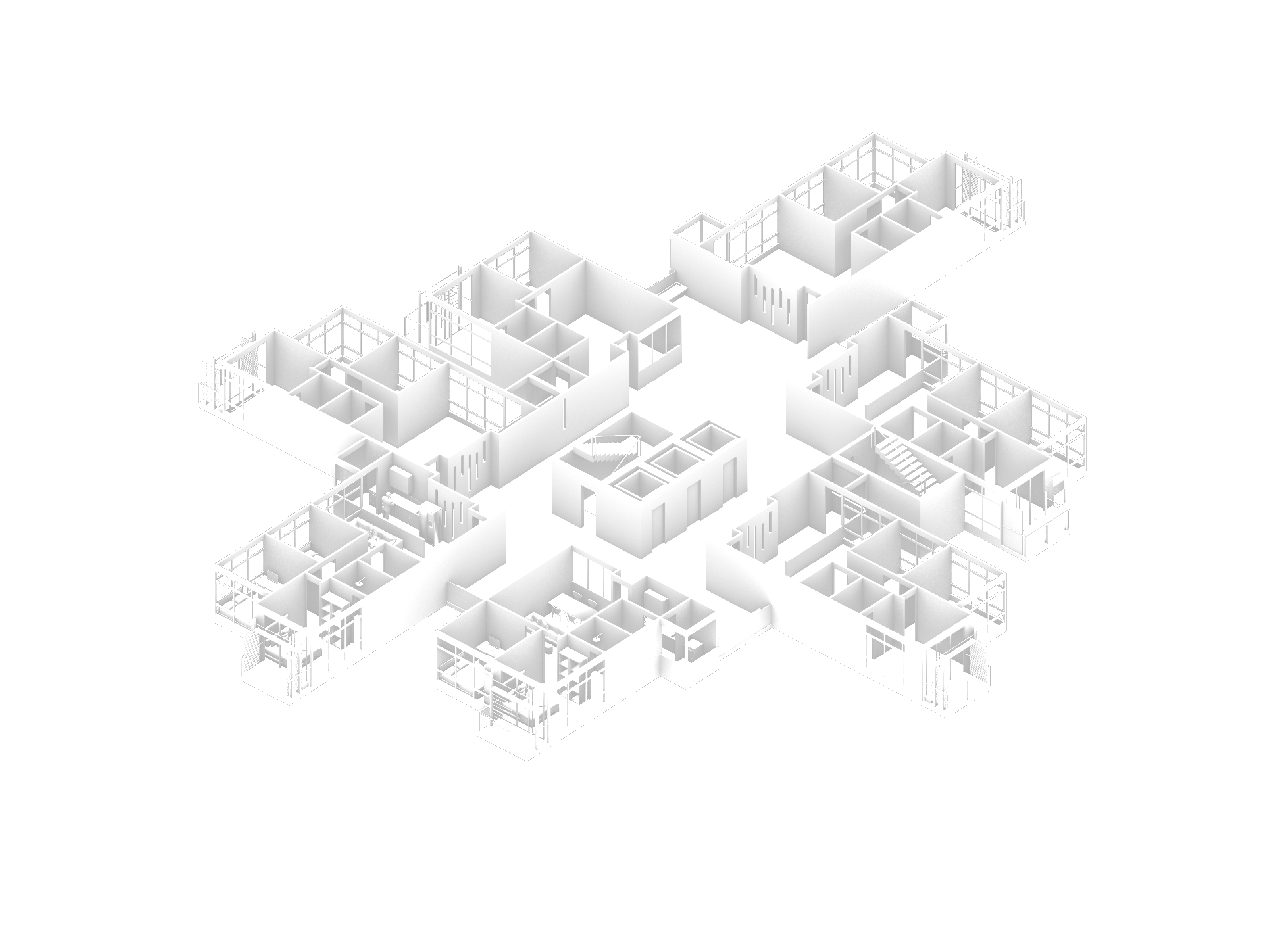 modernist exterior shot render an isometric architectural diagram of a modern apartment building featuring intricate rooms and open spaces use a color palette of bright white for walls and ceilings with accents of soft gray for floors and room dividers add small details with subtle shades of pastel blues and greens for a calming effect ensure the structure floats over a deep black background creating a sharp contrast illuminate the space with a warm ambient glow to create an elegant atmosphere architecture