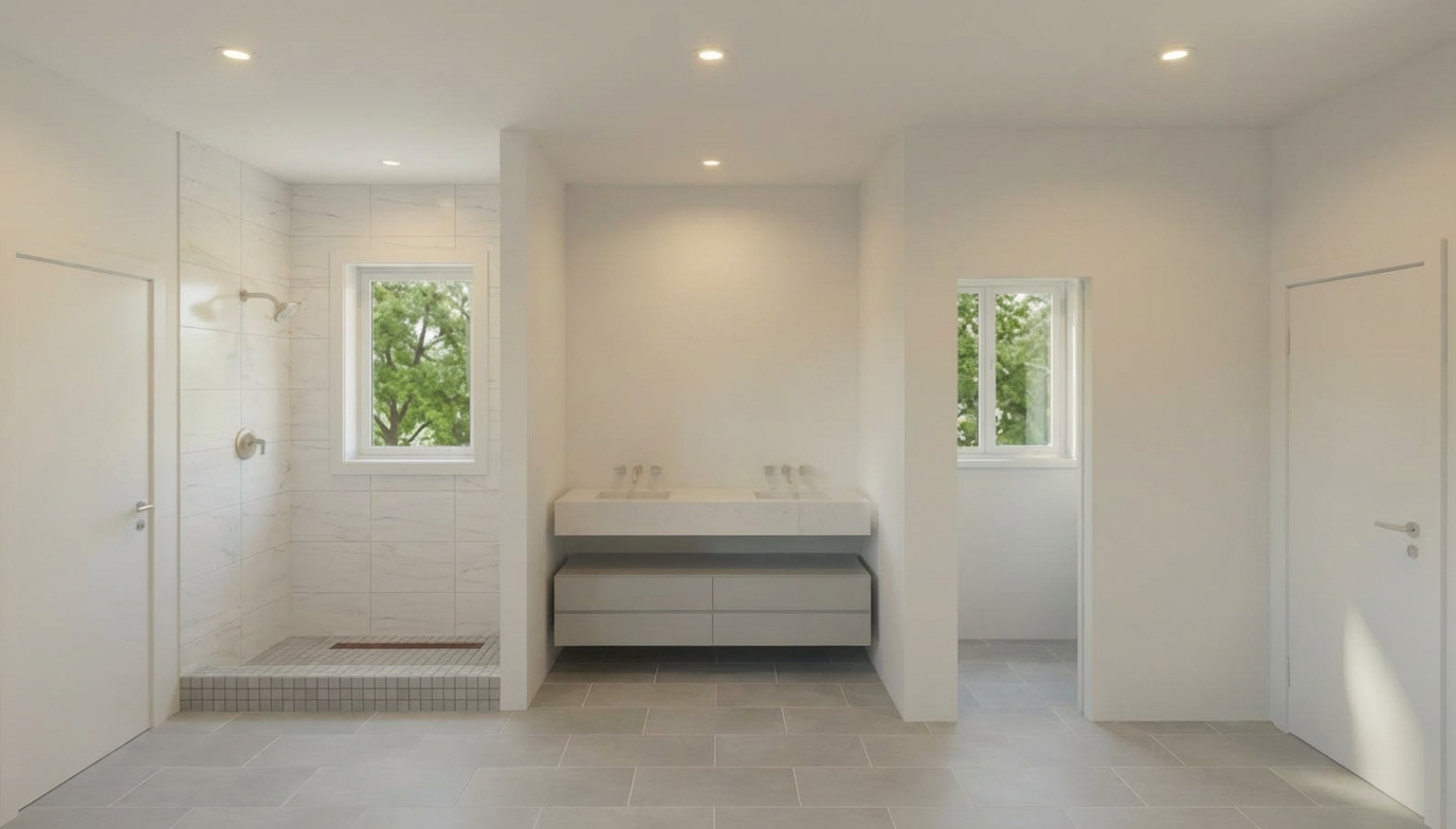 keep everything exactly the same in the rendering do not change the layout walls windows doors shower plumbing or vanity style just remove the time froom the shower threshold and make it white do not change anything else in the room