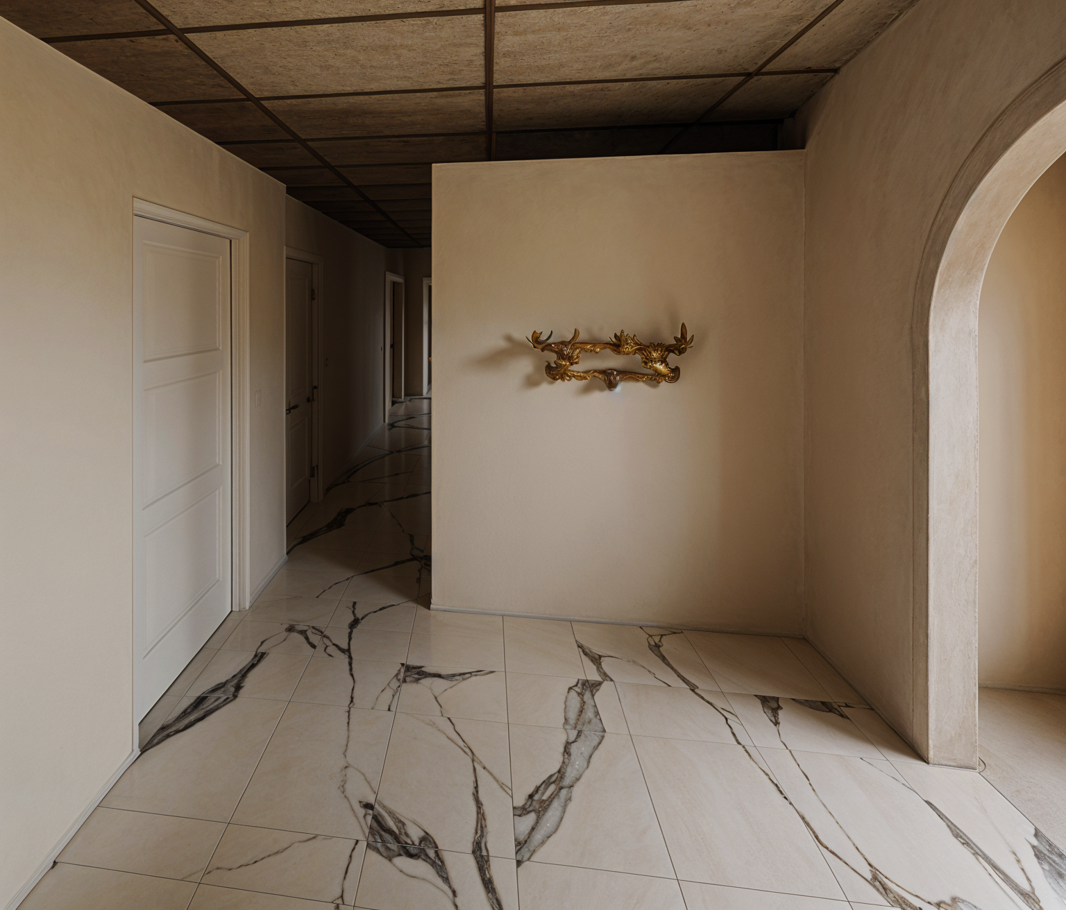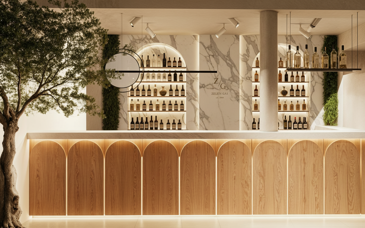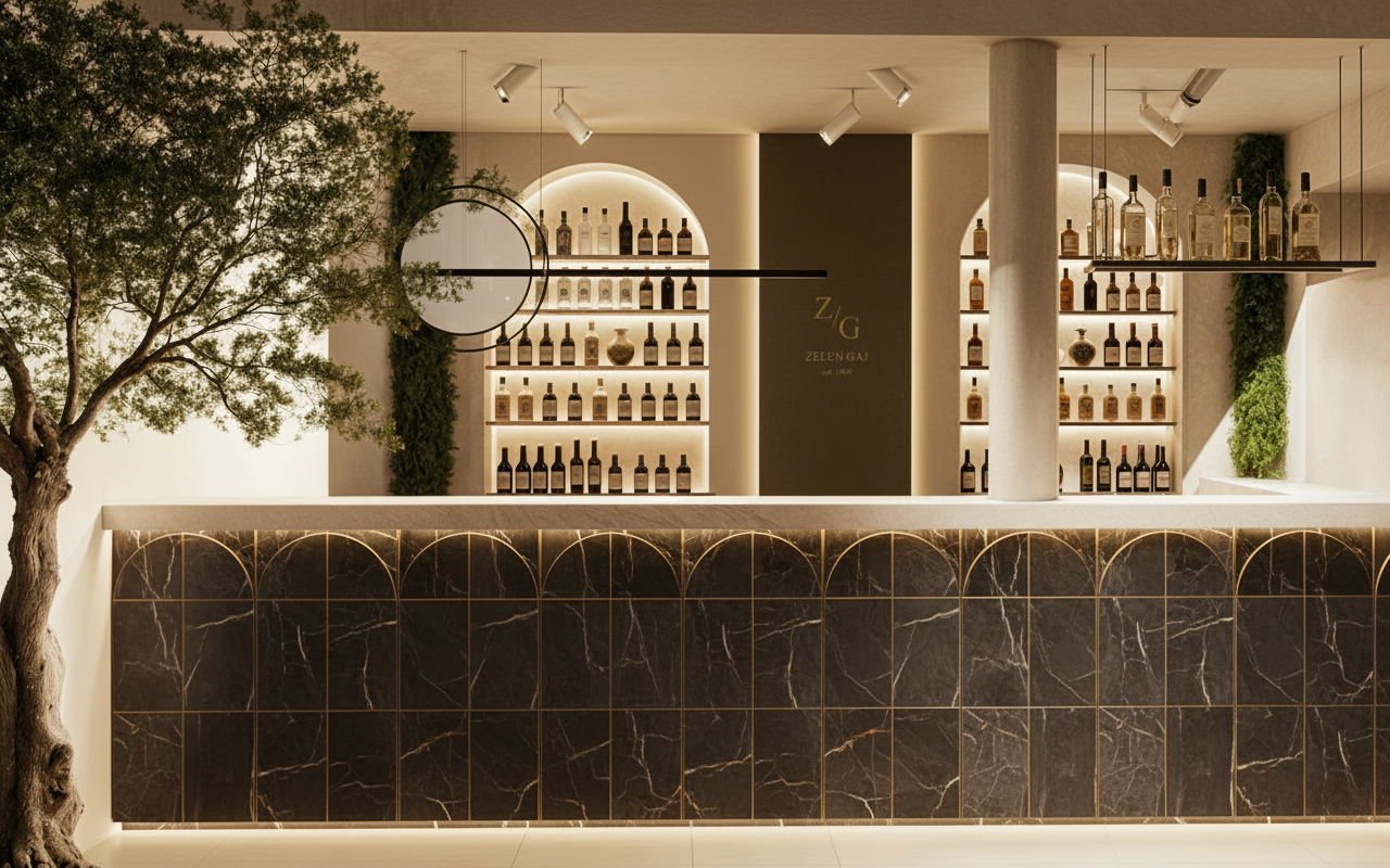 keep everything in the scene exactly the same same camera angle proportions lighting and composition only modify the wall surface of the bar counter cover the bar wall with dark large format marble panels with 1 mm thin grout lines in the same color as the marble keep the existing stone on the bar top exactly as it is do not change or remove it everything else in the scene must stay identical and high quality