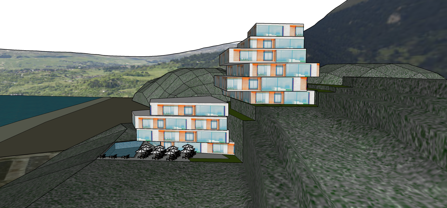 a serene landscape with terraced grassy hillsides vibrant green hues two modern minimalist white buildings with tiered structures a reflective calm blue pool in the foreground with stylish black patio umbrellas and chairs the scene overlooks a vast tranquil azure lake set under a bright crisp sky with the distant mountains casting soft shadows creating a peaceful and harmonious atmosphere