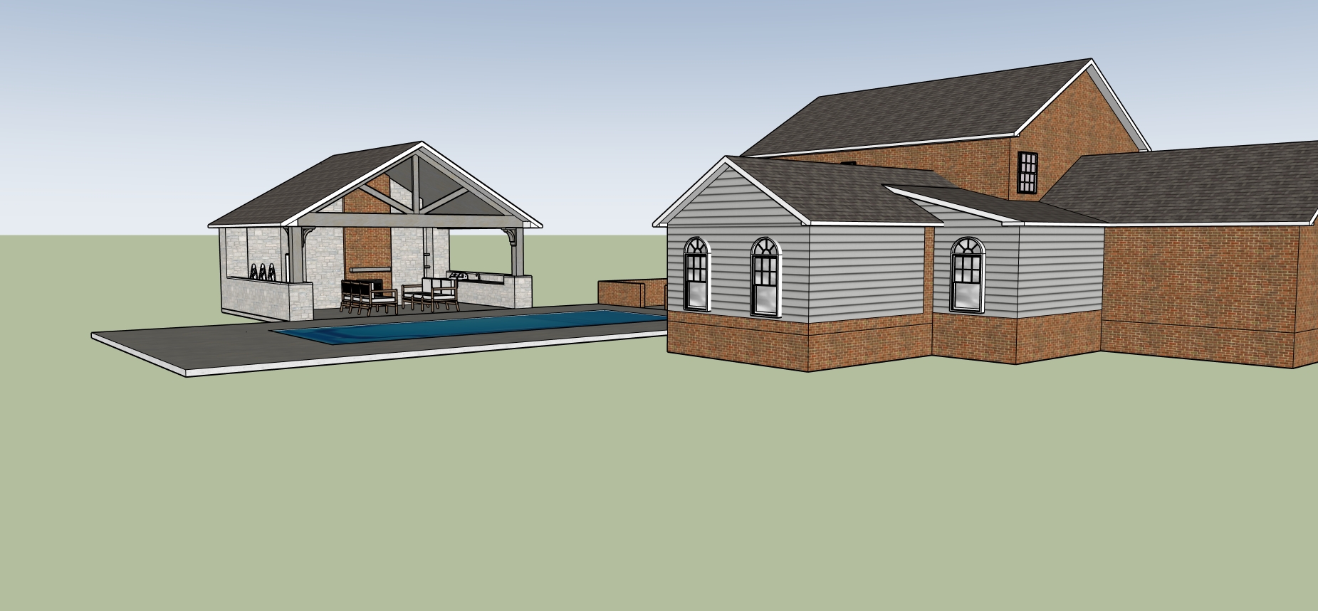 a manicured lawn layered flower beds low maintenance shrubs mature trees behind the pavillion house is in a neighborhood fireplace under pavillion white windows
