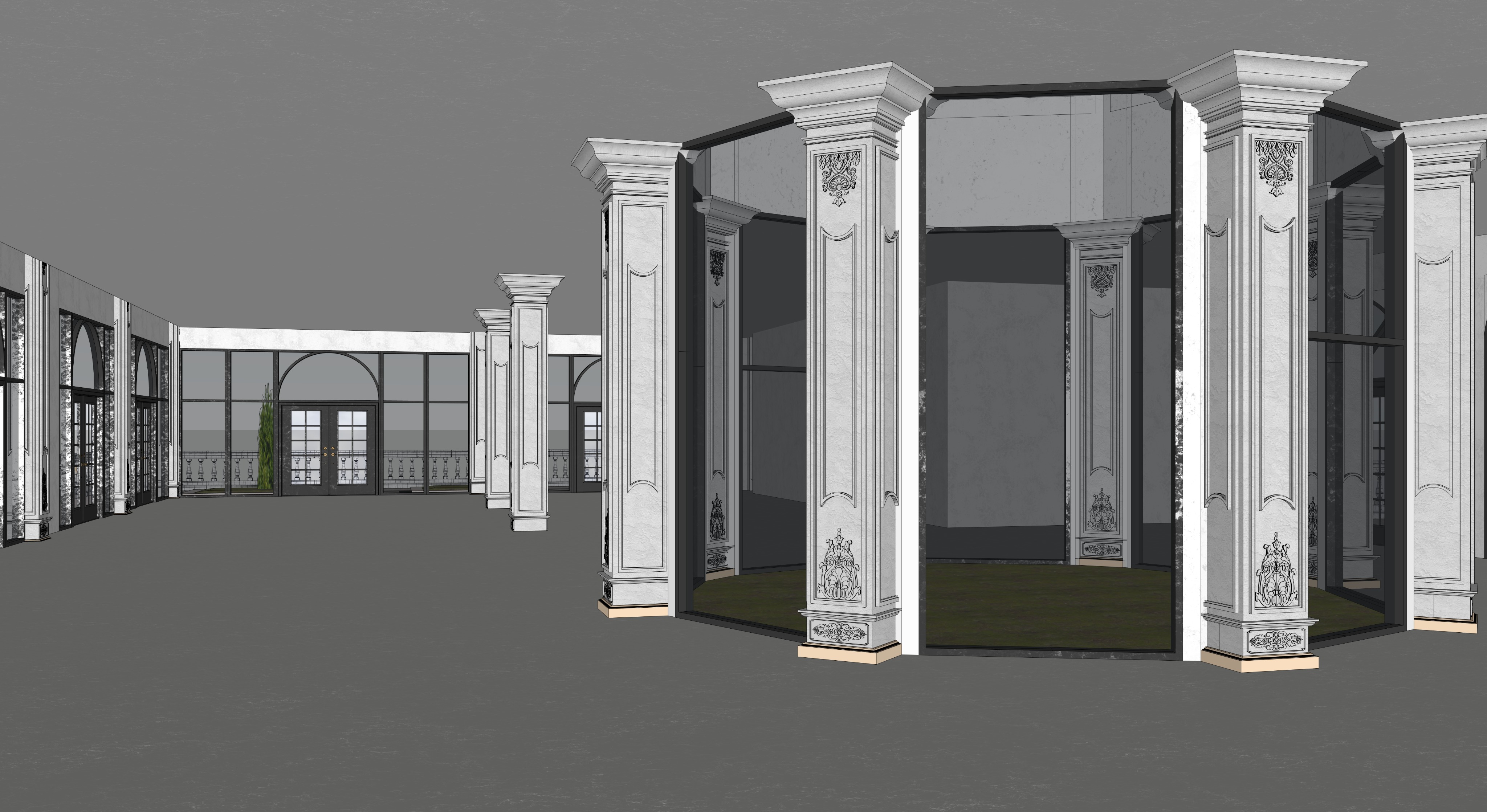 do not add put anything that is not in the prompt maintain the geometries maintain all the materials this is an interior french style architecture function hall building maintain the view camera position composition make this hyperrealistic add banquet tables with people populate the scene as if there is a wedding function decorate the interiors using french style architecture design the ceiling with french style architecture ceiling and lights add sea background lower the horizon line put a garden and tree inside the glass partition and have light shine through the skylight glass make it cinematic make it wedding vibes make it a clear weather make it super clear clean 8k quality