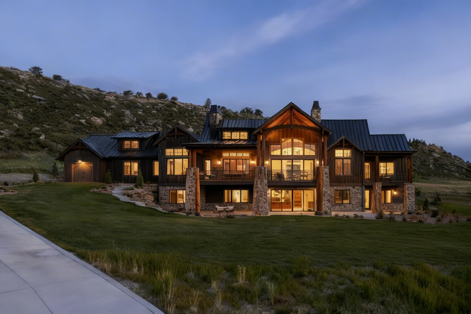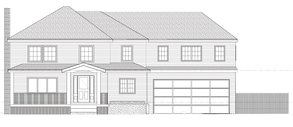 render this elevation to have dark grey shingles light cream colored siding with white trim make the front door a dark navy blue paint make the garage door white to match the trim color window frames should be black