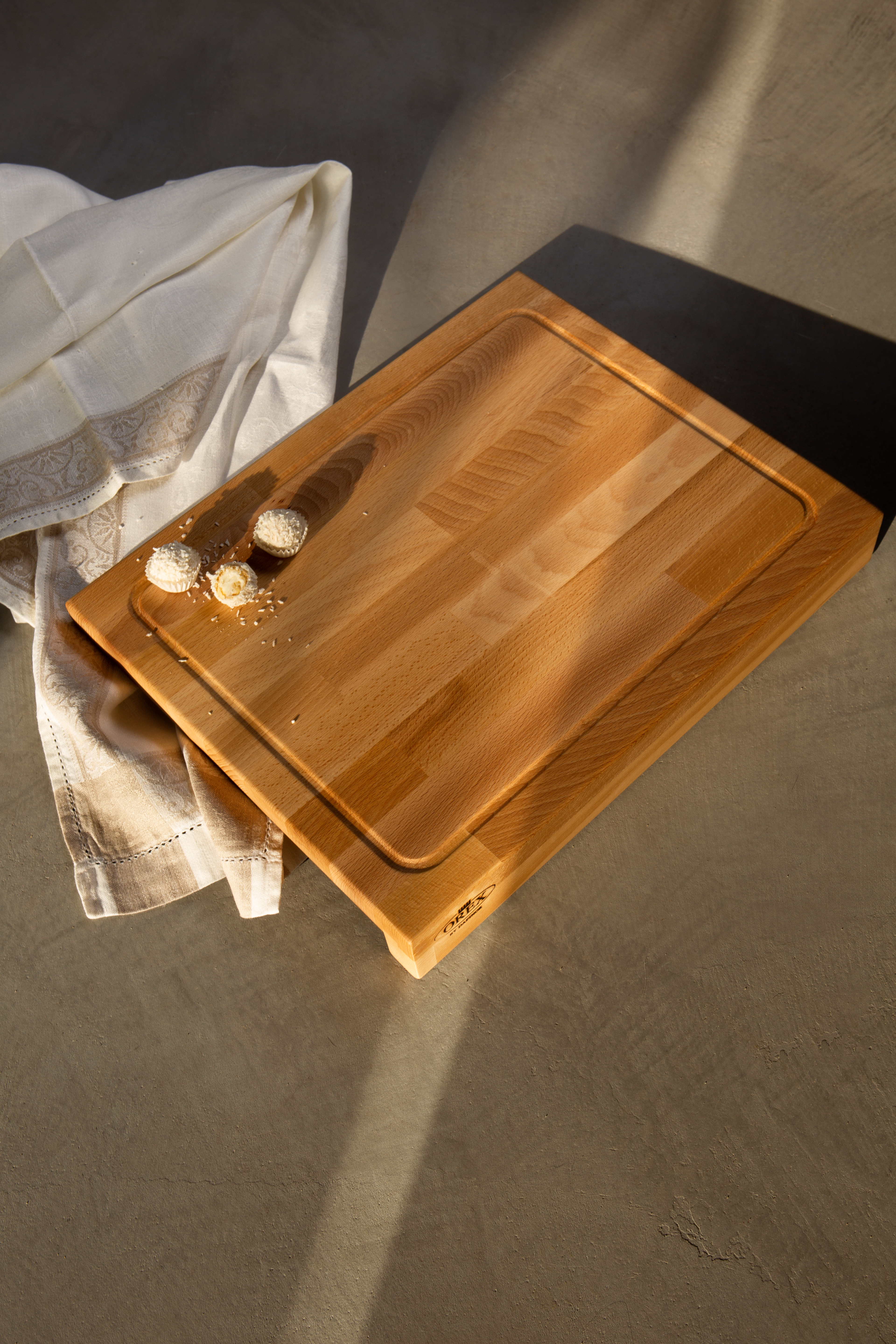 keep the orex cutting board exactly identical to the input image same wood grain 90 degree edge detail proportions color and texture do not modify the board place the board on a luxury kitchen island during christmas dinner preparation soft warm afternoon or golden hour lighting surroundings should feel festive but subtle blurred christmas tree lights in the background hints of greenery or holiday d cor gentle bokeh and elegant kitchen materials stone wood or marble show natural cooking elements around but not touching the board fresh herbs vegetables or christmas dinner ingredients in soft focus maintain the board as the clear focal point sharp crisp hero product aesthetic high end warm cinematic premium lifestyle photography no distortion no props covering the board and preserve the 90 degree edge clearly visible