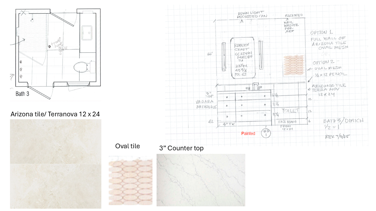 can you create a render of these 42 wide pianted white cabinete withe 6 drawers and knobs a tolet on the right hand and a robern mirror back walll arizona terranova tile 12 x 24 all the way to 42 high and then oval tile all the way to the cealling white 3 coaunter top and polished 24 x 48 nature white