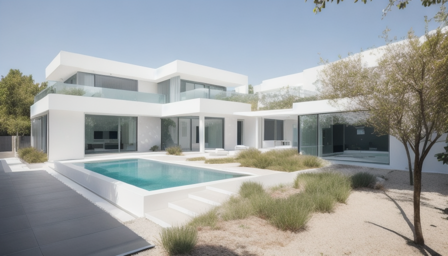 exterior shot modern southern villa facade is with white concrete frame around windows screens and bleached oak wood walls ground floor natural stone walls