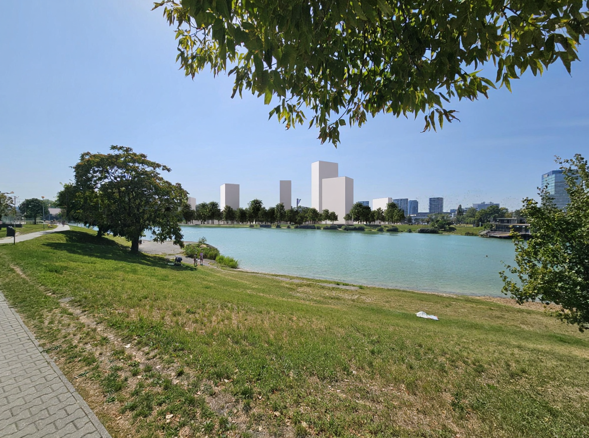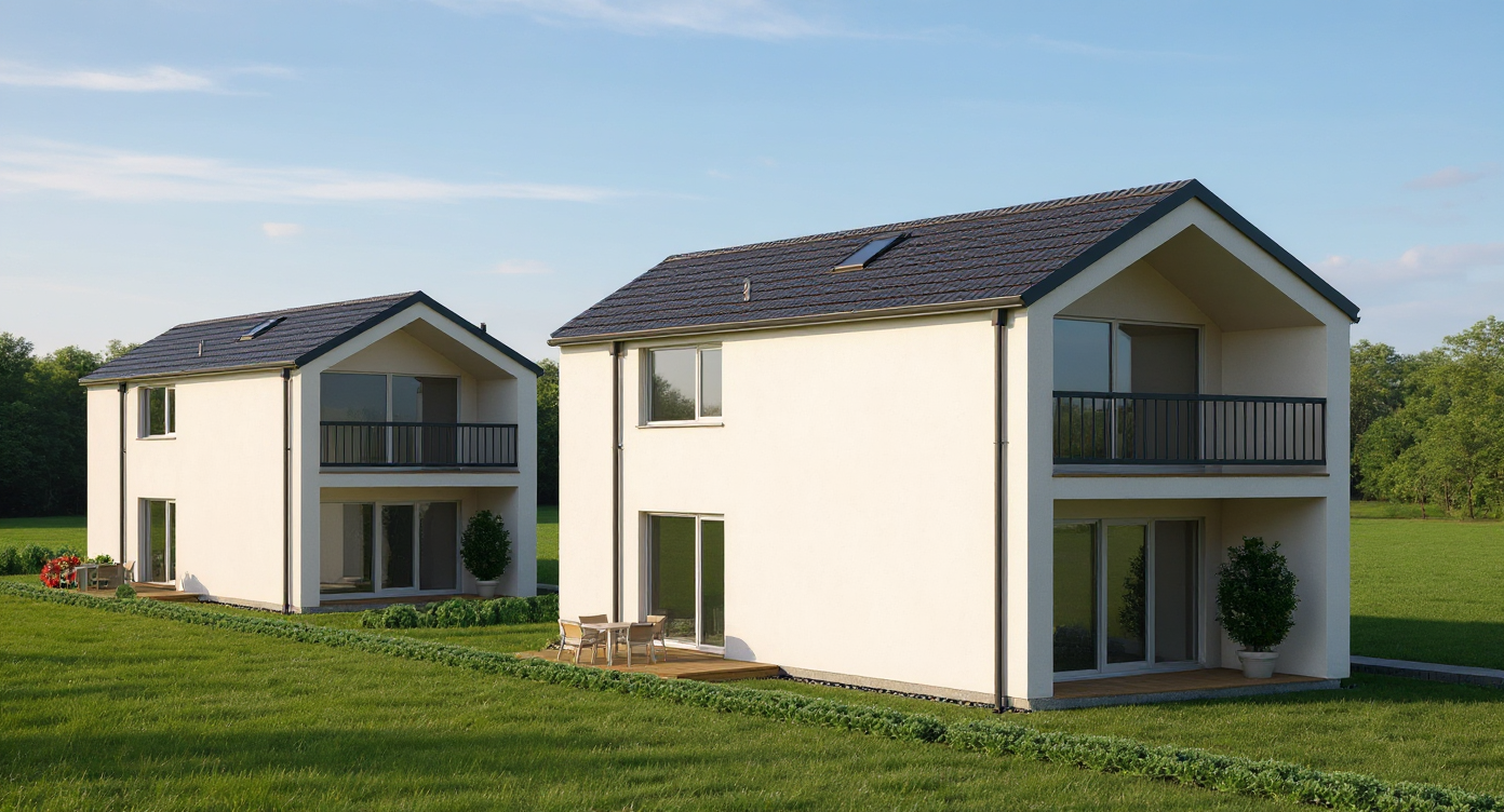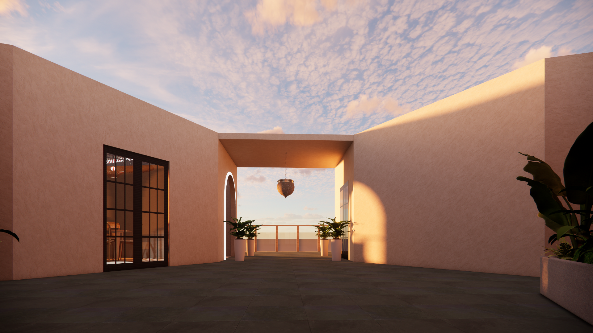 render a serene courtyard with smooth beige walls under a soft glowing morning light the pathway is paved with muted green and purple tiles creating an elegant tranquil atmosphere add a large lush planter with vibrant green plants on the left while a tall sleek white planter with a broad leafed plant stands on the right the atmosphere is peaceful and inviting capturing the warmth and calm of a perfect morning enhanced by the delicate play of shadows and light