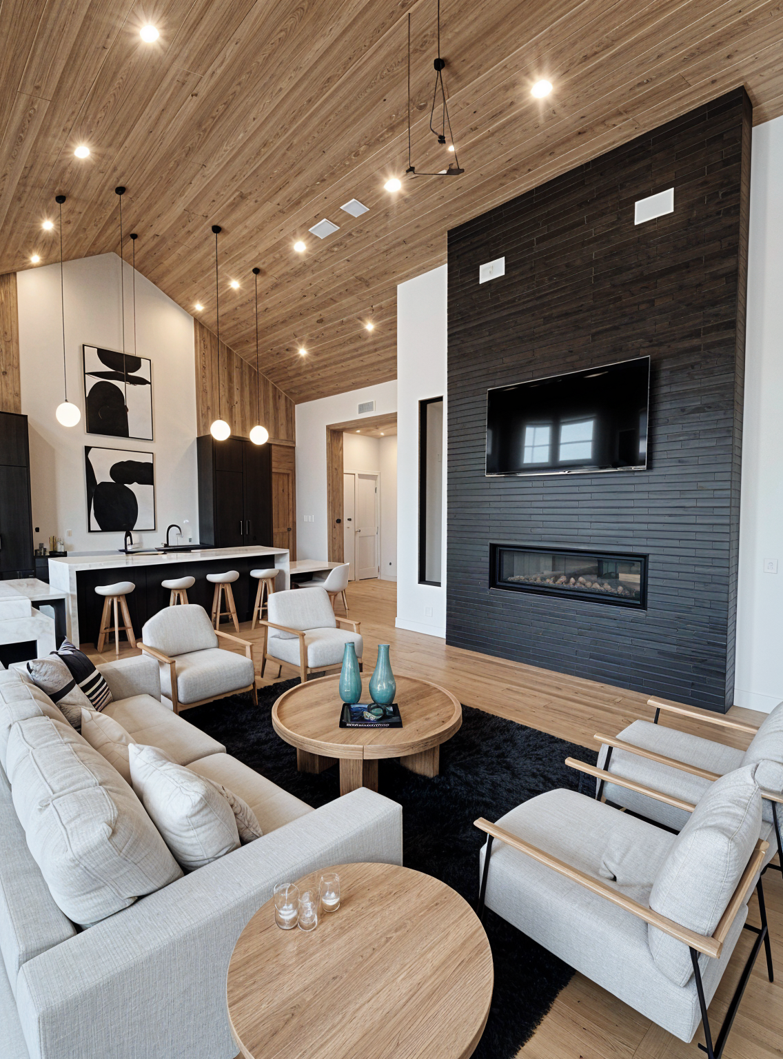 add a modern patterned rug in blue and white under the seating grouping change the vases on the coffee table to be translucent cobalt blue glass add blue pillows in each chair