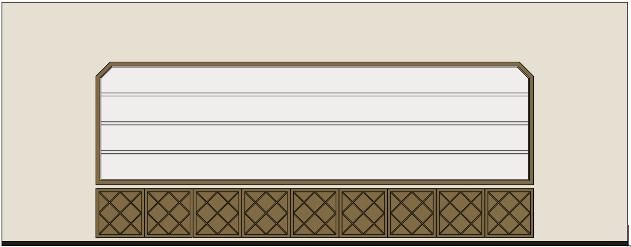 give me a rendering of this elevation it is a built in all of it is flush with the surrounding wall wall is a creamy plaster warm oak for the drawer fronts frame with a crosillion pattern shelving inset is a shiney white lacquer lit up