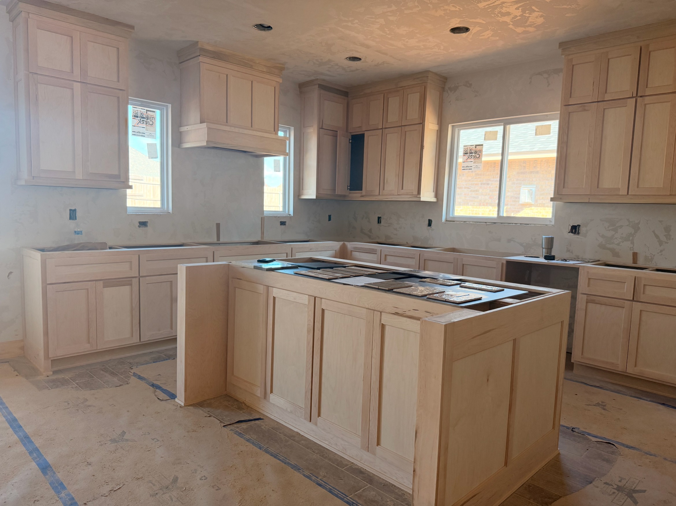 add a dark walnut stain to the island and sherwin williams evergreen fog green to the rest of the cabinets add a solid grey countertop to the island and a white quartz to the rest of the countertops