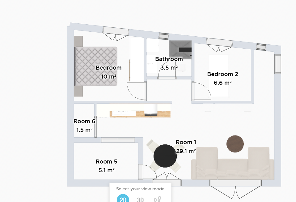 convert this floor plan into a realistic isometric 3d view of a full house show the space from an elevated angle with furniture walls and details visible minimalistic couch on u in front of television left bottom room is balcony left door in kitchen is pantery bathroom rght side of the sink is washing machine and boiler right room is kids room we need minimalistic style kitcggen modern and in kashmir colour 2 bedrooms need warderobe use the same furniture as shows on the plan do not change the orientation of the floorplan