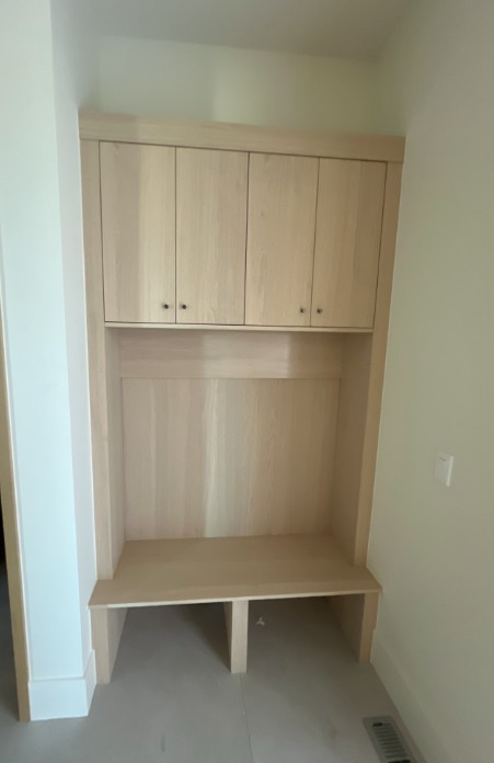 add natural lighting shoes in the cubbies below put hooks on the board below the upper cabinet with a coat and purse hanging include a sconce on the right wall with light going up and down