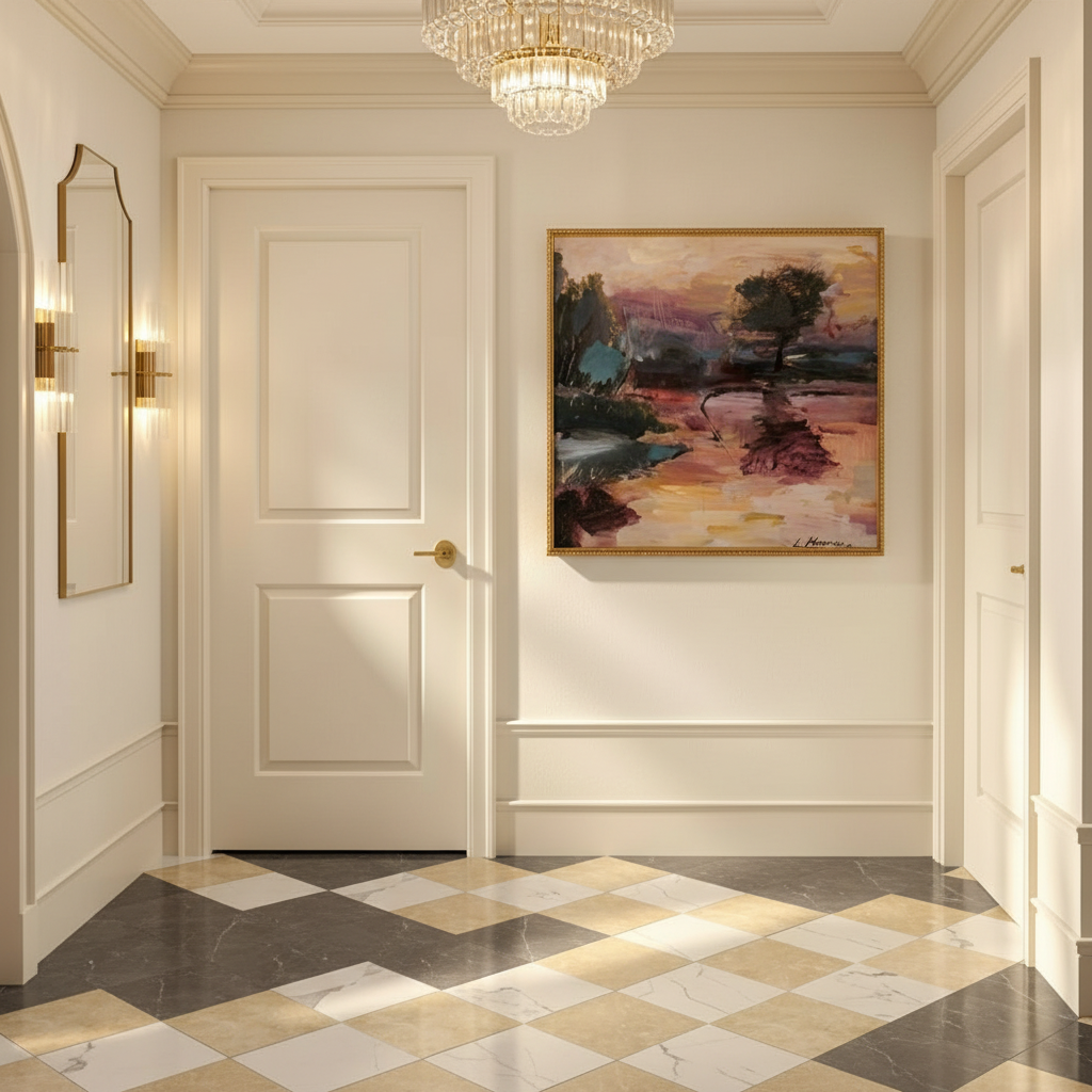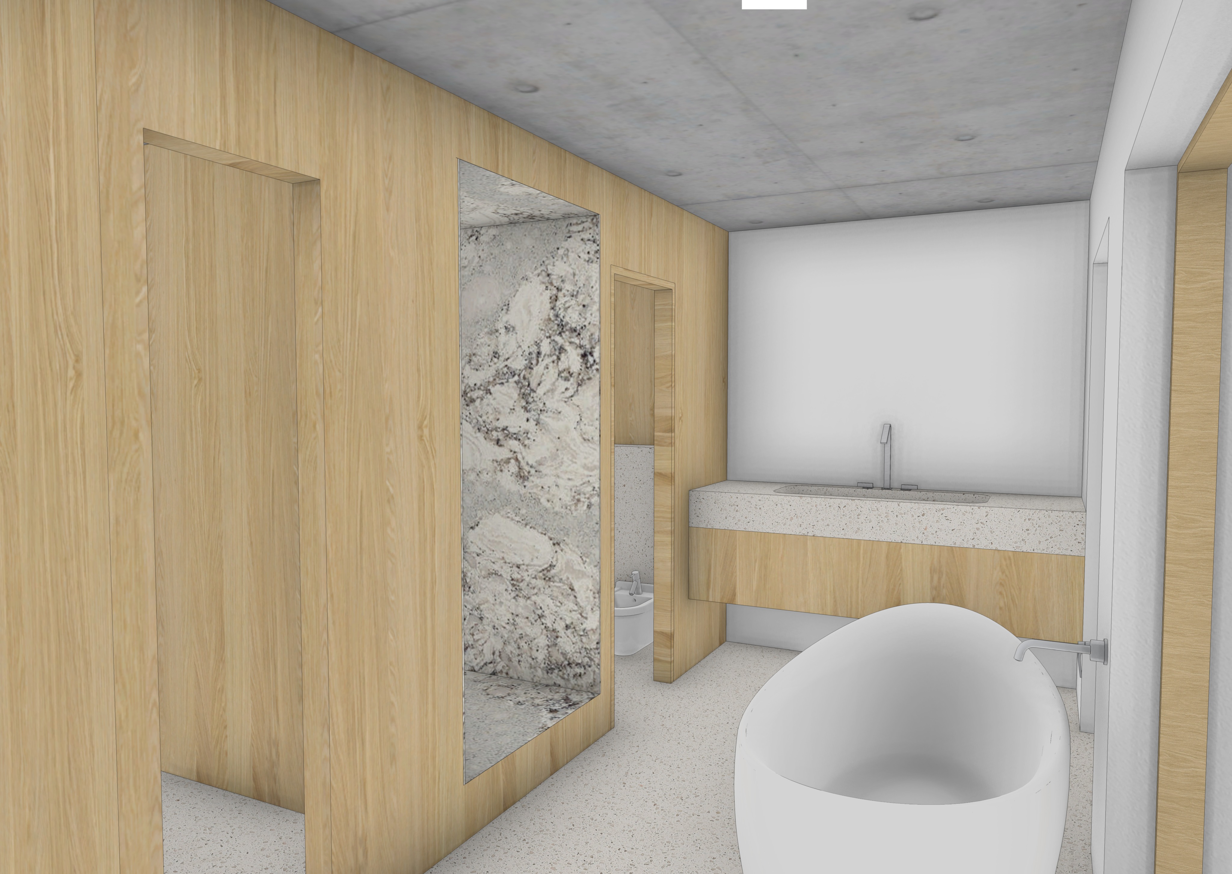 add atmospheric sunlight coming through the windows to the right and a wall filling mirror behind the sink keep the materials