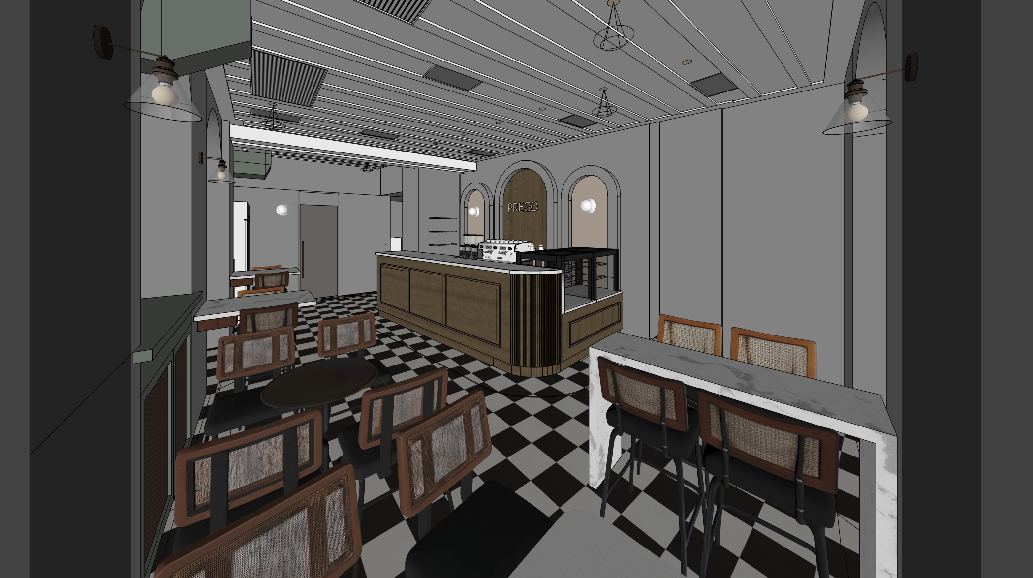 mediterranean revival interior shot prompt minimal italian caf version transform the provided coffee bar interior image into a high end photorealistic render of a refined minimal italian caf with a warm and elegant morning coffee atmosphere the architecture and geometry must remain exactly as in the original image do not change move resize or alter any walls ceilings bar shapes furniture positions shelving structures booths curtains windows or spatial layout all elements must stay in their exact positions proportions and alignment the transformation should focus only on materiality lighting atmosphere and styling while preserving the entire original design design direction apply a minimal italian caf aesthetic with elegant timeless materials and calm mediterranean tones use a refined palette such as grey soft cappuccino tones walnut wood brushed bronze or brass accents natural stone or marble matte leather upholstery warm neutral ceramics materials choose materials that reflect contemporary italian caf interiors grey light plaster or microcement walls in soft sand beige tones refined natural dark wood finishes such as walnut or light oak subtle polished stone or marble surfaces floor the flooring should appear as a classic black and white checkerboard ceramic tile floor inspired by traditional italian caf s alternating matte white and deep black tiles subtle ceramic texture very thin grout joints around 1 mm perfectly aligned checkerboard pattern polished but not overly glossy surface the pattern must follow the existing floor geometry and perspective exactly matte leather seating and elegant metal frames all materials must appear realistic premium and tactile with visible textures natural imperfections and subtle reflections lighting create a bright but warm morning caf atmosphere natural daylight entering the space warm italian style bronze lighting fixtures soft shadows and gentle highlights balanced brightness suitable for a relaxed breakfast coffee setting lighting should enhance material richness and spatial depth styling add tasteful lifestyle elements while keeping all furniture positions unchanged espresso cups and cappuccino glasses small breakfast plates or pastries subtle caf table styling include a few modern guests casually socializing and two bartenders behind the bar preparing coffee naturally integrated and correctly scaled without overcrowding the space bar display keep the bar structure exactly the same but style it with minimal italian caf materials the display counter should appear filled with pastries and cakes with realistic glass reflections and texture bar shelves should feature wine bottles and premium spirits softly illuminated with warm accent lighting final look the final image should feel like a luxury architectural photograph of a minimalist italian caf emphasizing vintage simplicity warm mediterranean tones premium materials italian vintage atmosphere while preserving the original geometry and layout exactly as designed architecture