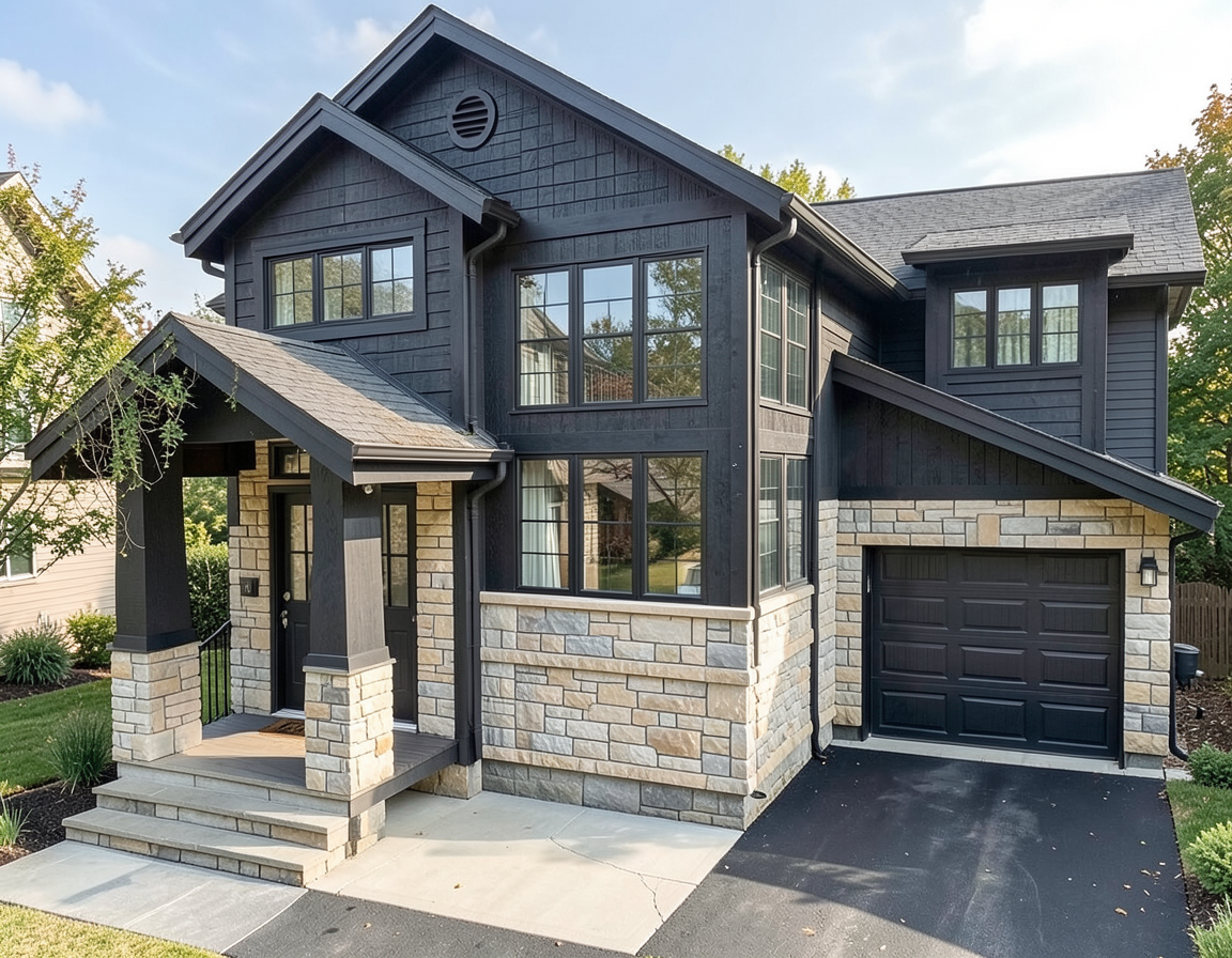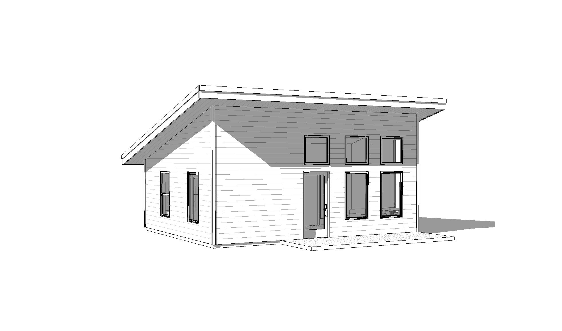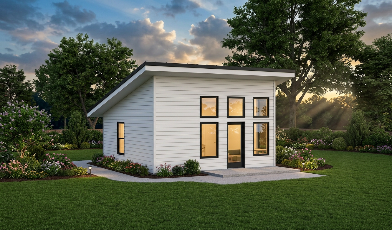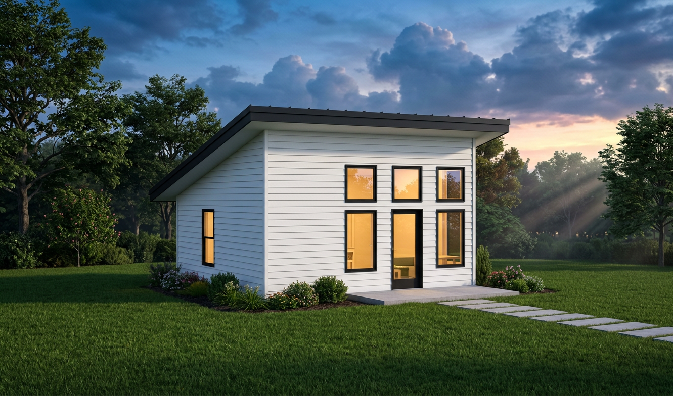 front view of a modern clean adu architectural exterior home rendered in cinematic vibrant dusk lighting with bits of blue skies and sunlight coming through the clouds adu in a dense neighborhood setting with faint streaks of light coming through trees in the surrounding area warm glow and reflections off of the windows blue sky with big billowy clouds clean white hardie siding green manicured landscape around structure with gardens and patches of grass black standing seam metal roof prominent trees in the background high fidelity photorealistic visualization crisp shadow falloff refined facade geometry soft atmospheric depth premium architectural photography mood ultra clean composition and materials black window trim photorealistic render small concrete path around the exterior of the adu hide concrete foundation grass in the foreground black window trim