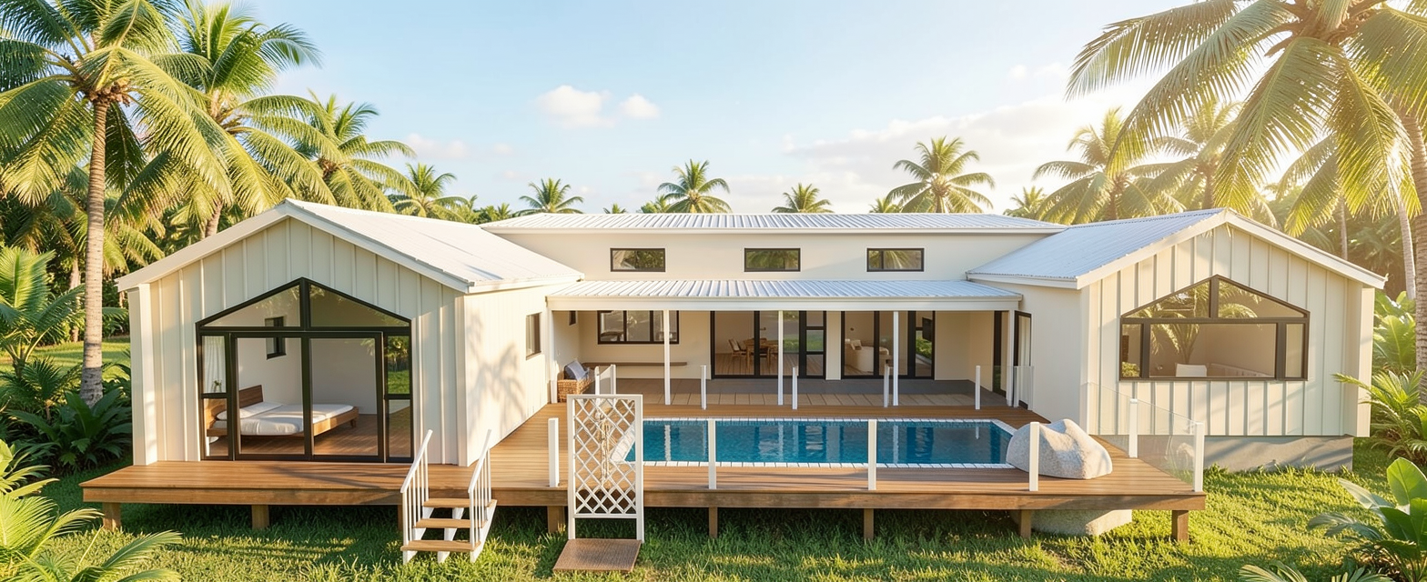 add a rectangular pool on the left side of the house add a gazebo with teak furniture and white cushions add fancy landscaping put a black aluminum dance around the pool and gazebo make the siding sherwin williams iron ore color do not add any brick or stone make the roof charcoal make the windows black